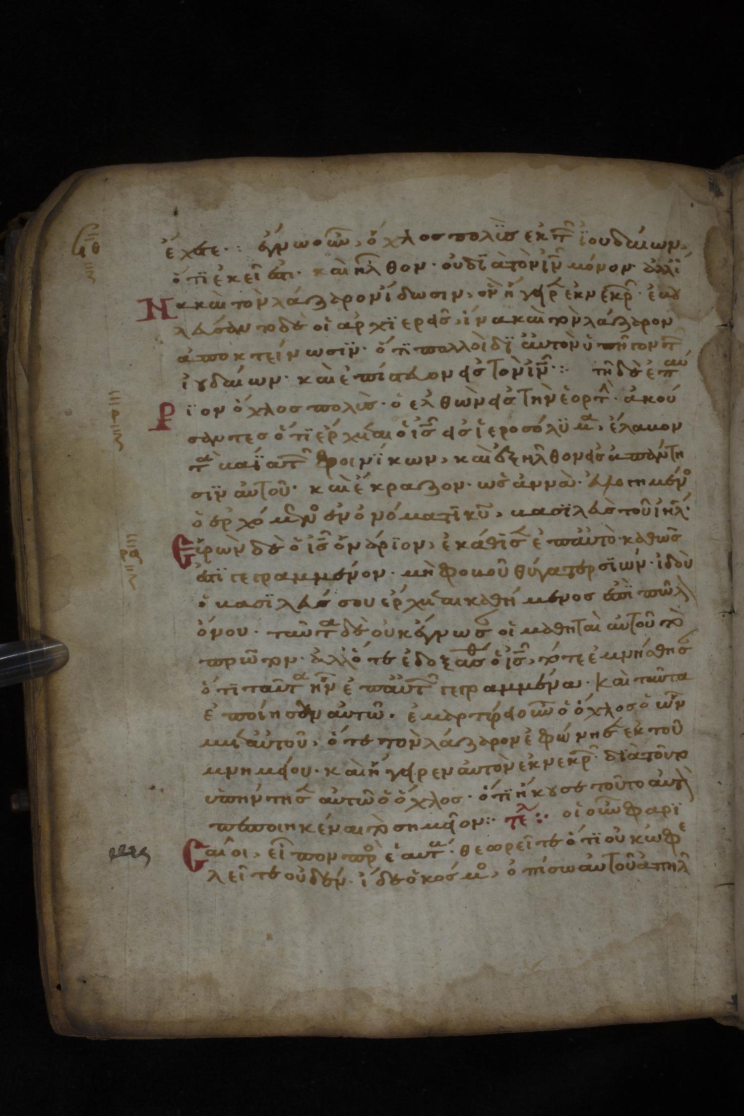Twelfth century minuscule of the Gospels on parchment; 181 leaves, 1 column, 23-24 lines per column. Images were taken at the National Library of Greece in Athens.