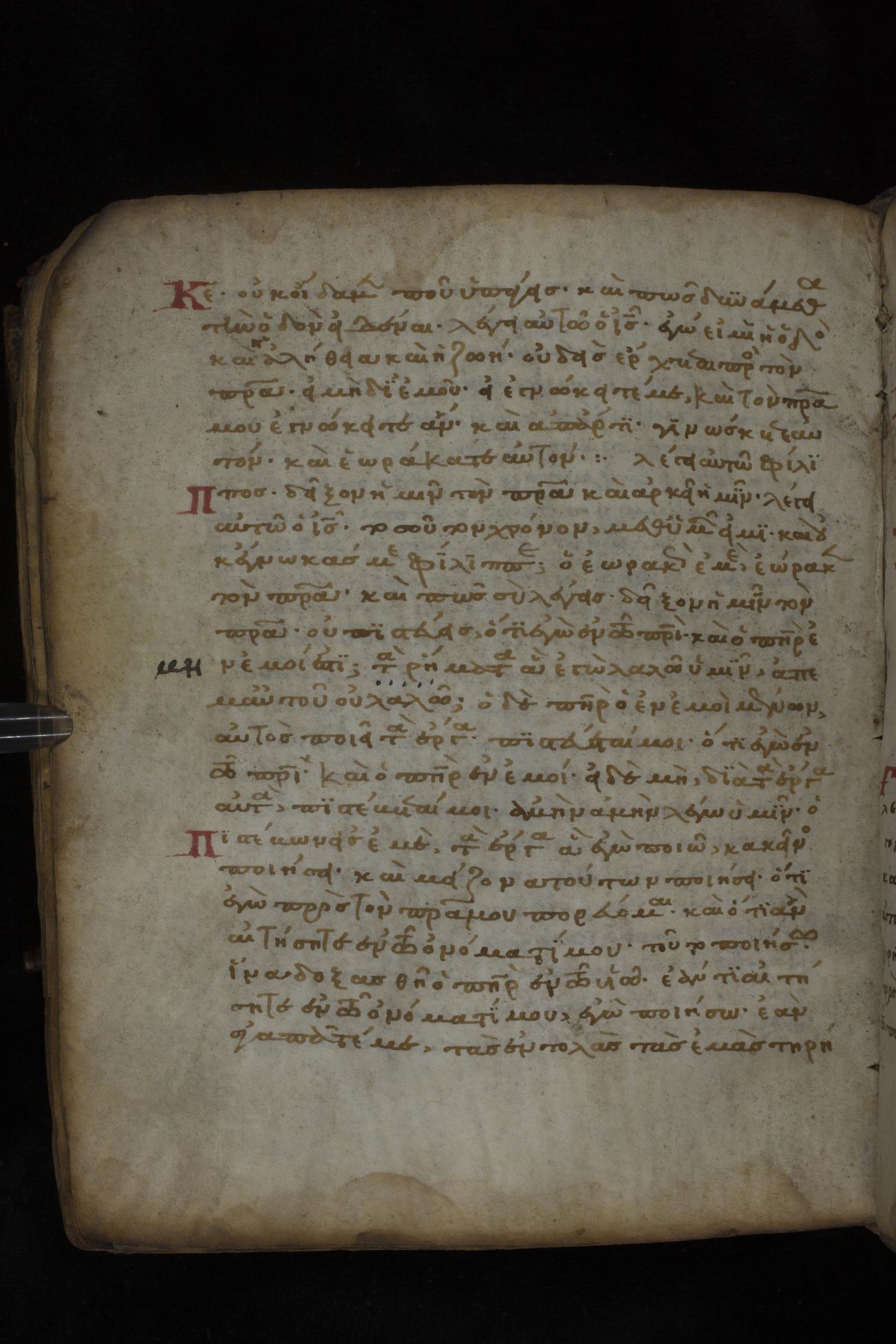 Twelfth century minuscule of the Gospels on parchment; 181 leaves, 1 column, 23-24 lines per column. Images were taken at the National Library of Greece in Athens.