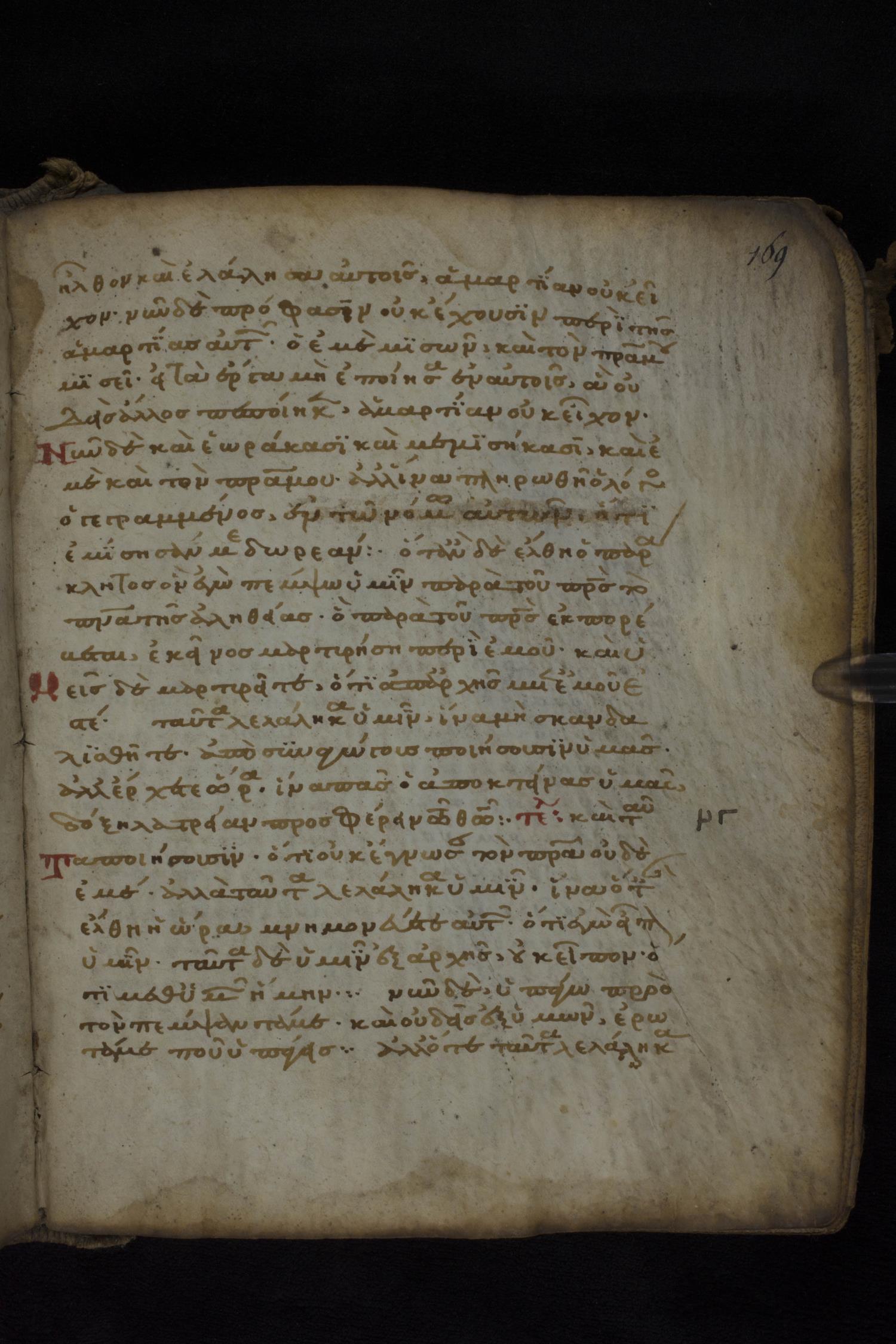 Twelfth century minuscule of the Gospels on parchment; 181 leaves, 1 column, 23-24 lines per column. Images were taken at the National Library of Greece in Athens.