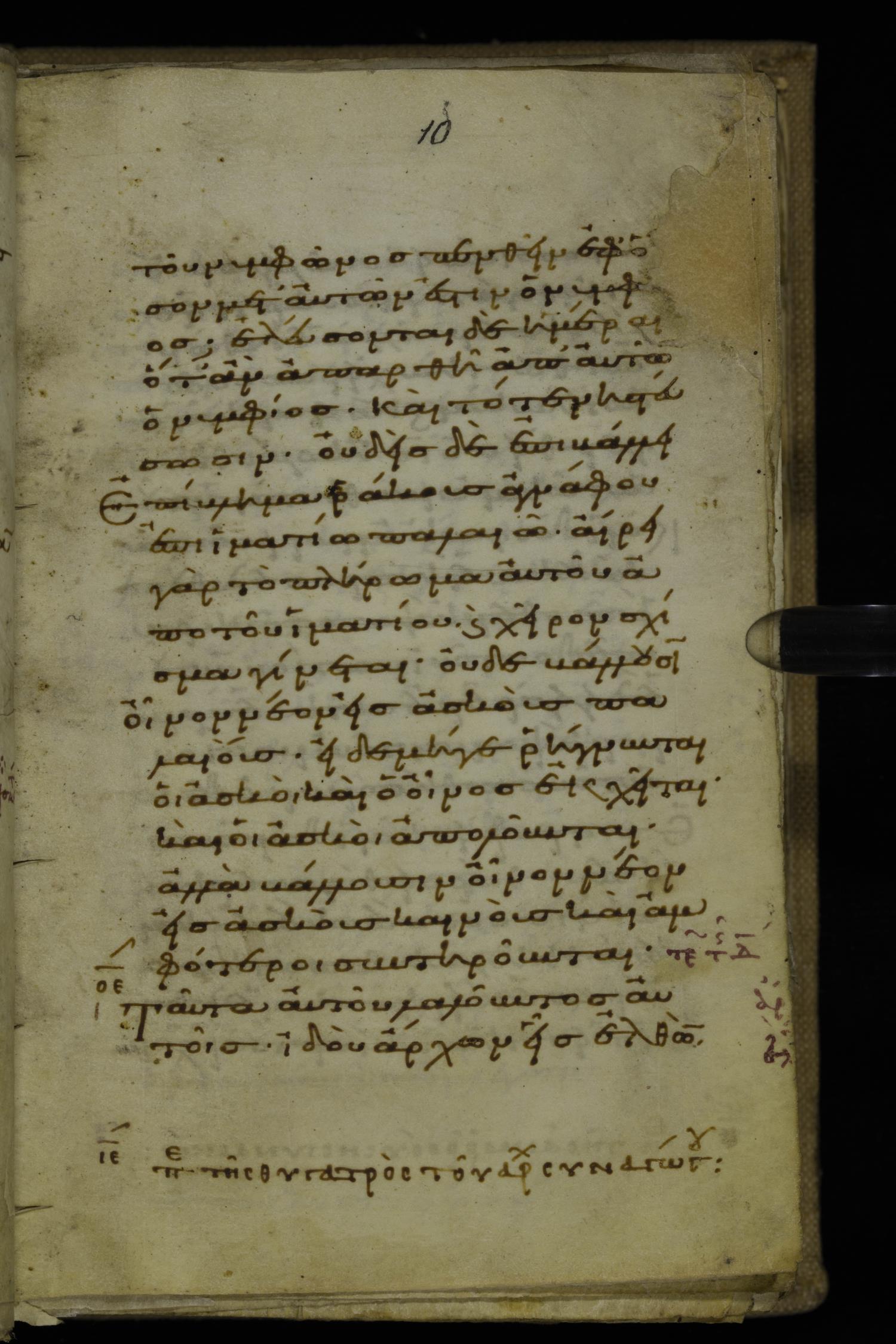 Tenth century minuscule of the Gospels on parchment; 220 leaves, 1 column, 20-21 lines per column. Images were taken at the National Library of Greece in Athens.