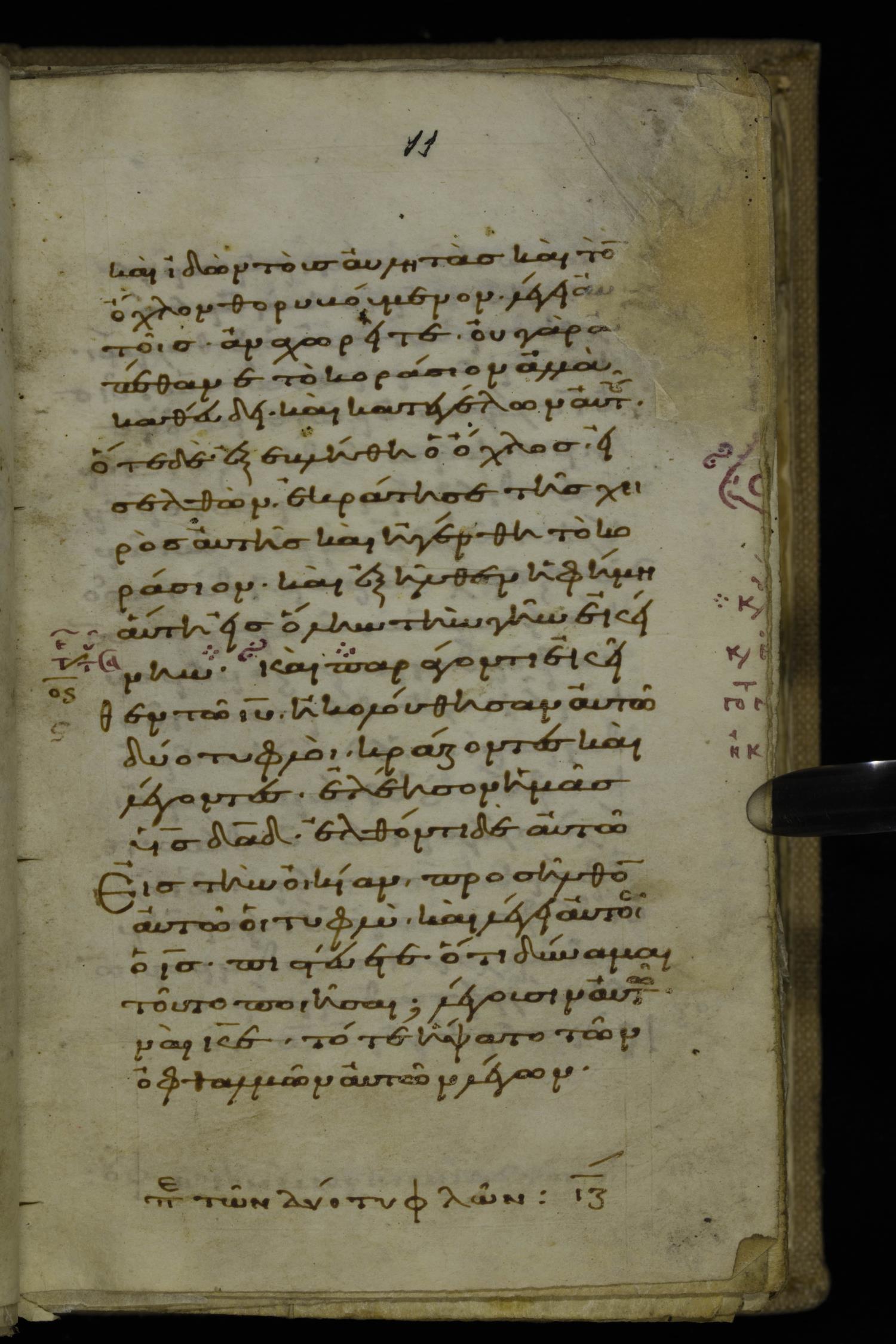 Tenth century minuscule of the Gospels on parchment; 220 leaves, 1 column, 20-21 lines per column. Images were taken at the National Library of Greece in Athens.