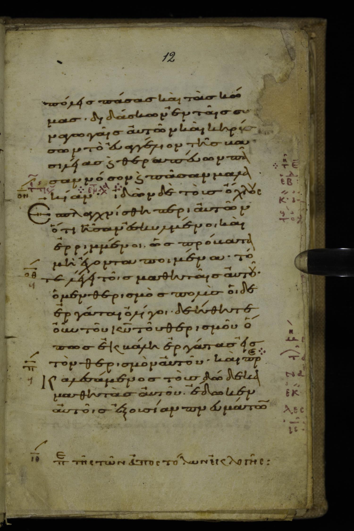 Tenth century minuscule of the Gospels on parchment; 220 leaves, 1 column, 20-21 lines per column. Images were taken at the National Library of Greece in Athens.