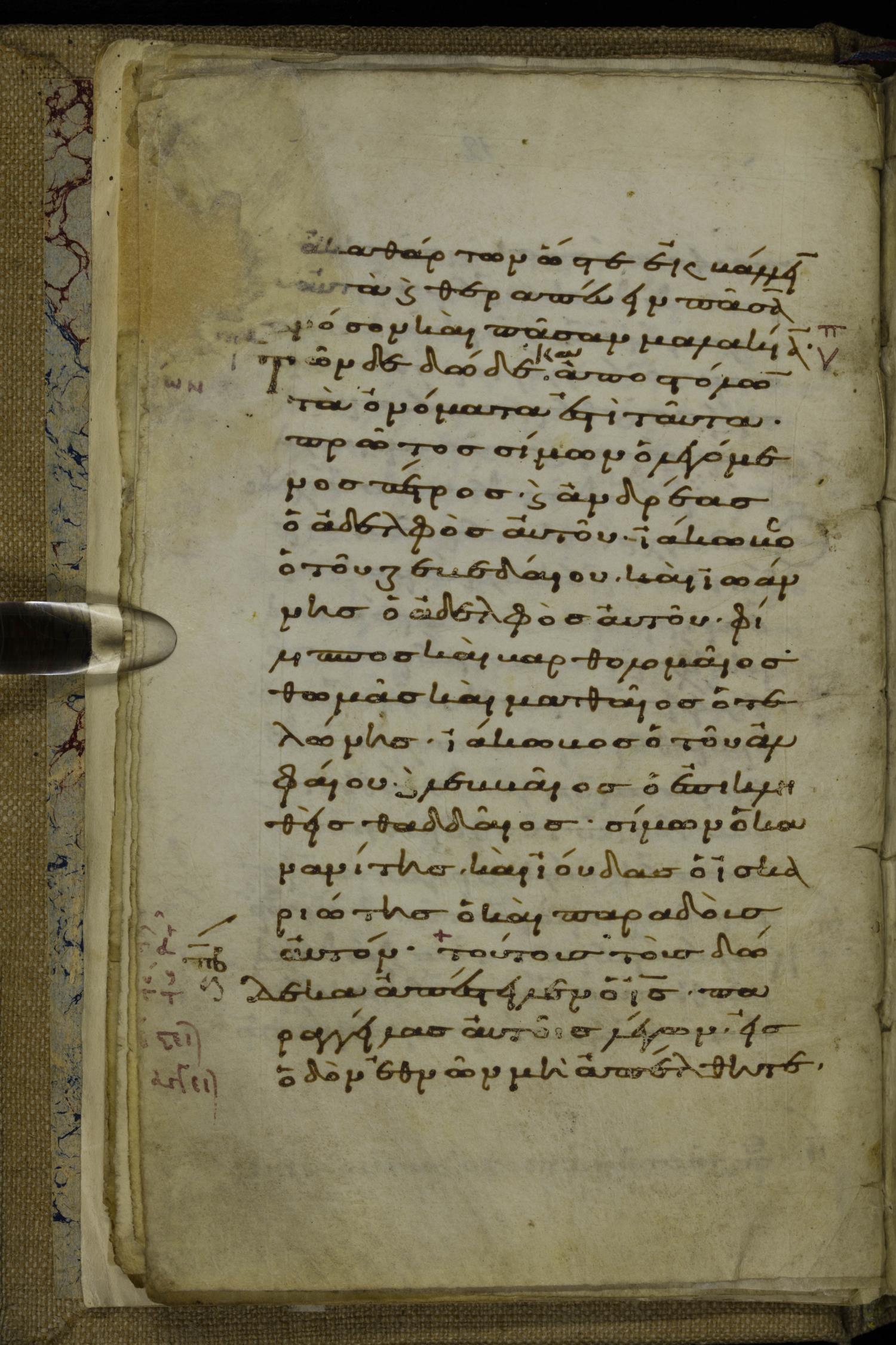 Tenth century minuscule of the Gospels on parchment; 220 leaves, 1 column, 20-21 lines per column. Images were taken at the National Library of Greece in Athens.