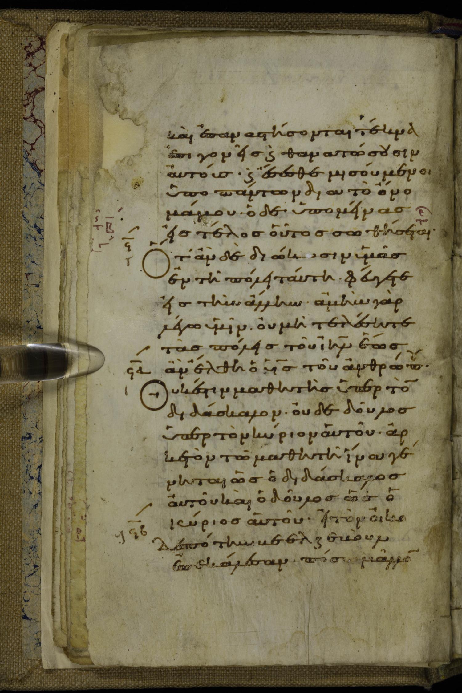 Tenth century minuscule of the Gospels on parchment; 220 leaves, 1 column, 20-21 lines per column. Images were taken at the National Library of Greece in Athens.