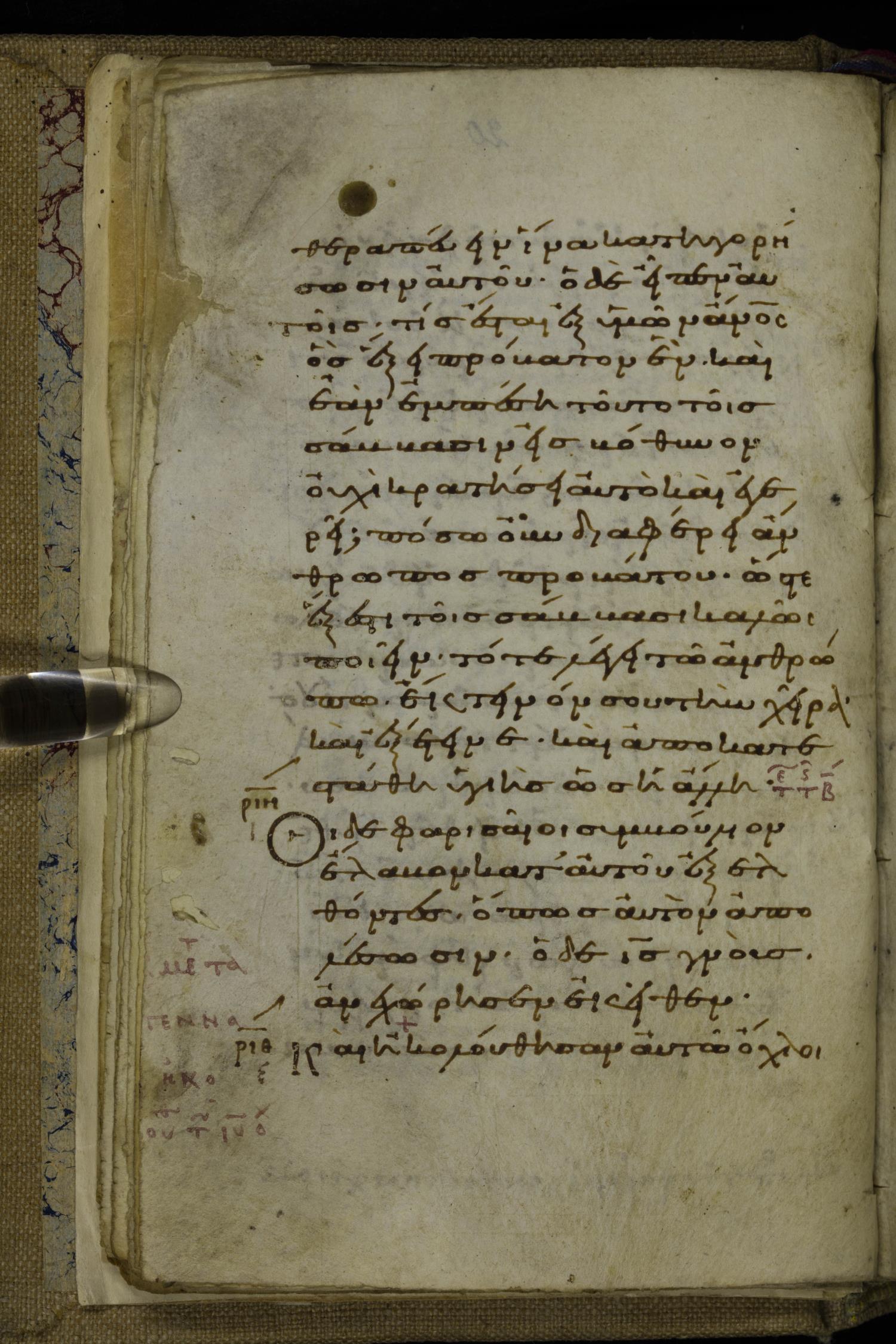 Tenth century minuscule of the Gospels on parchment; 220 leaves, 1 column, 20-21 lines per column. Images were taken at the National Library of Greece in Athens.