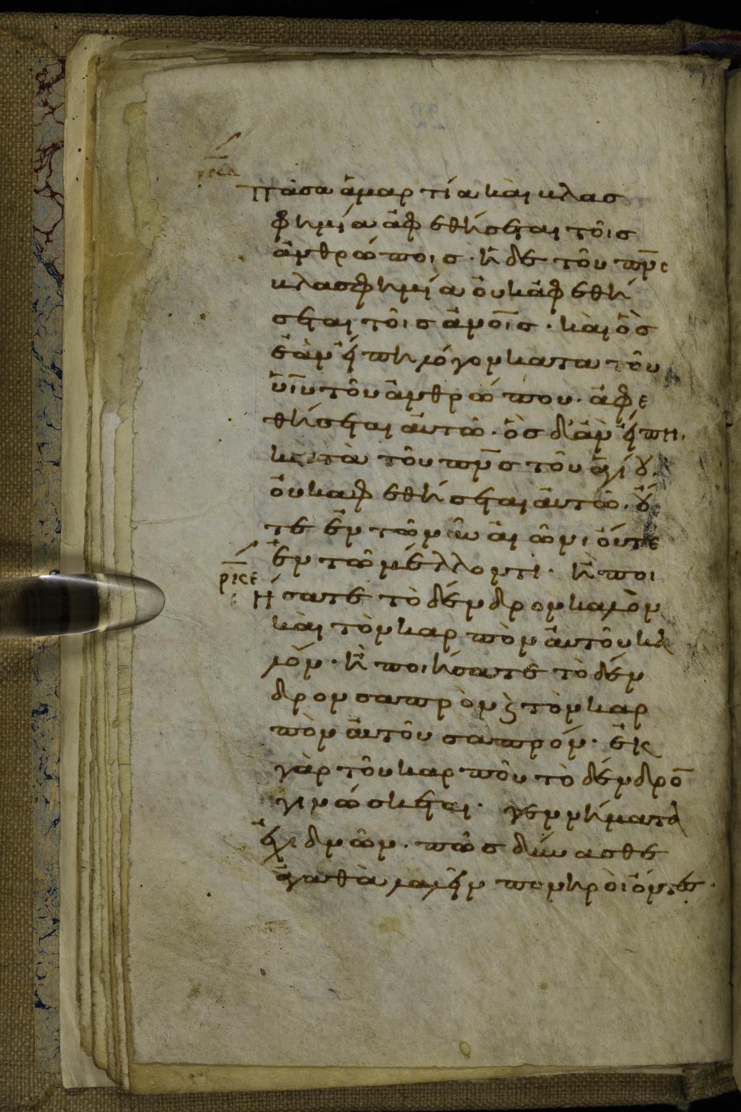 Tenth century minuscule of the Gospels on parchment; 220 leaves, 1 column, 20-21 lines per column. Images were taken at the National Library of Greece in Athens.