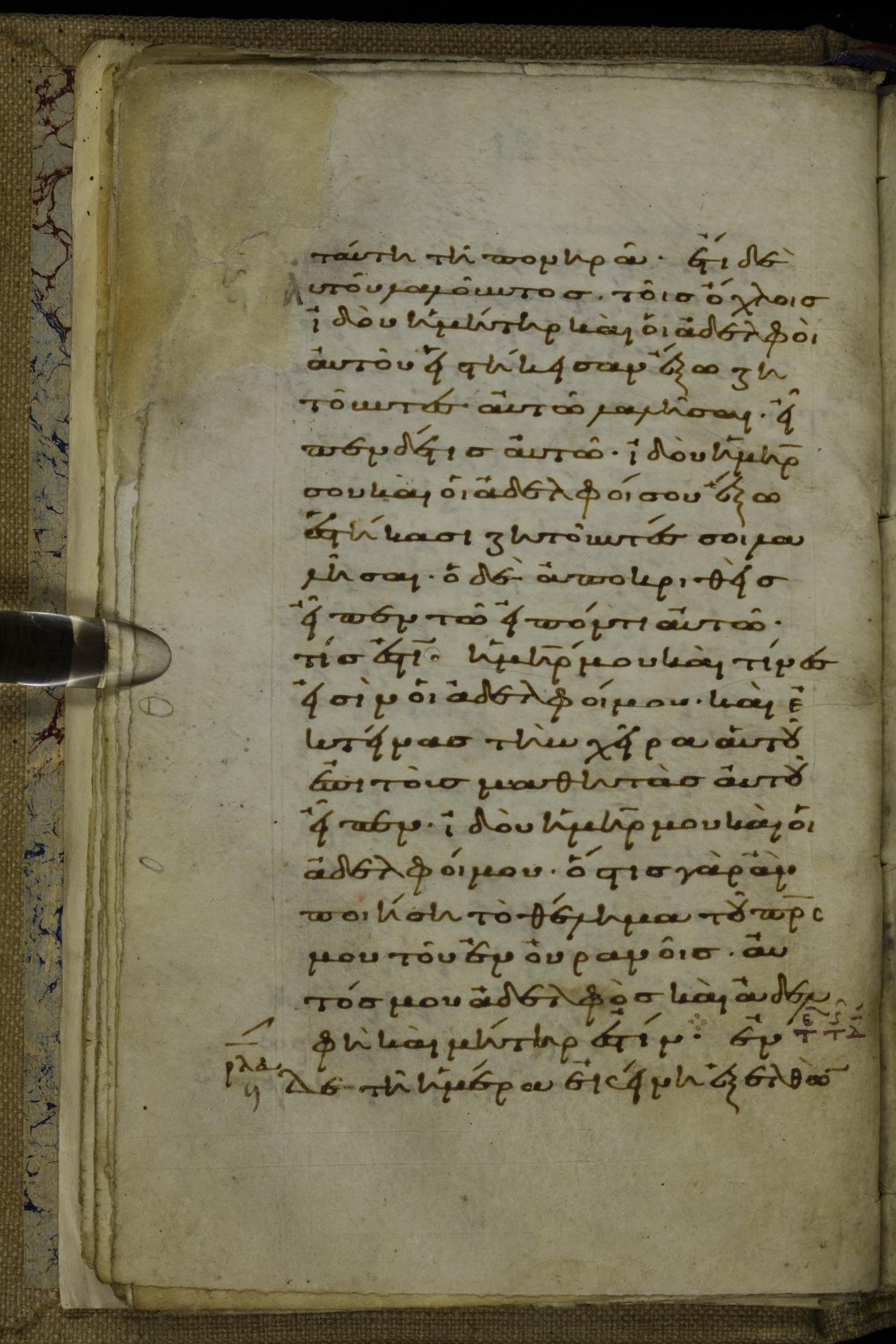 Tenth century minuscule of the Gospels on parchment; 220 leaves, 1 column, 20-21 lines per column. Images were taken at the National Library of Greece in Athens.