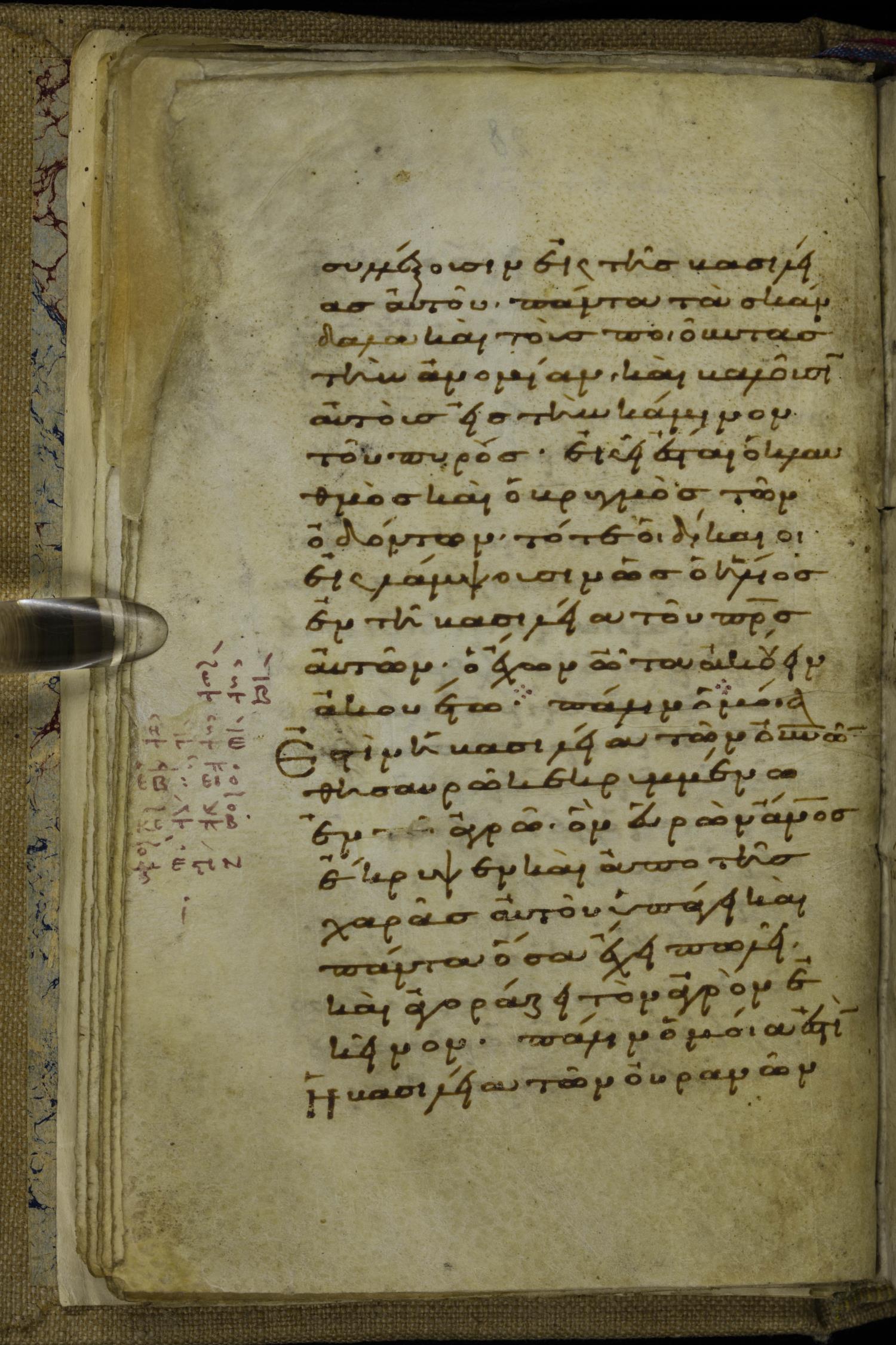 Tenth century minuscule of the Gospels on parchment; 220 leaves, 1 column, 20-21 lines per column. Images were taken at the National Library of Greece in Athens.