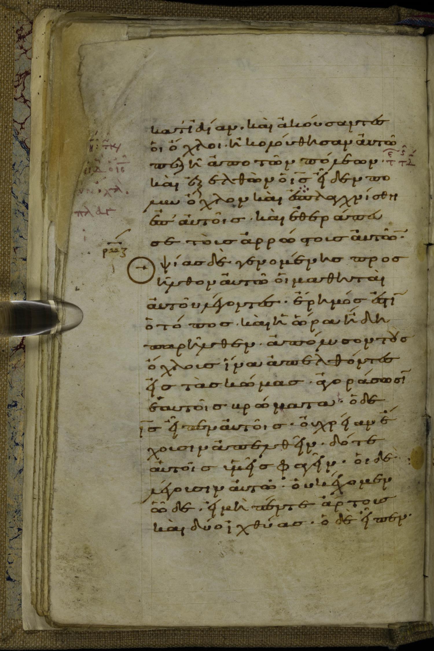 Tenth century minuscule of the Gospels on parchment; 220 leaves, 1 column, 20-21 lines per column. Images were taken at the National Library of Greece in Athens.