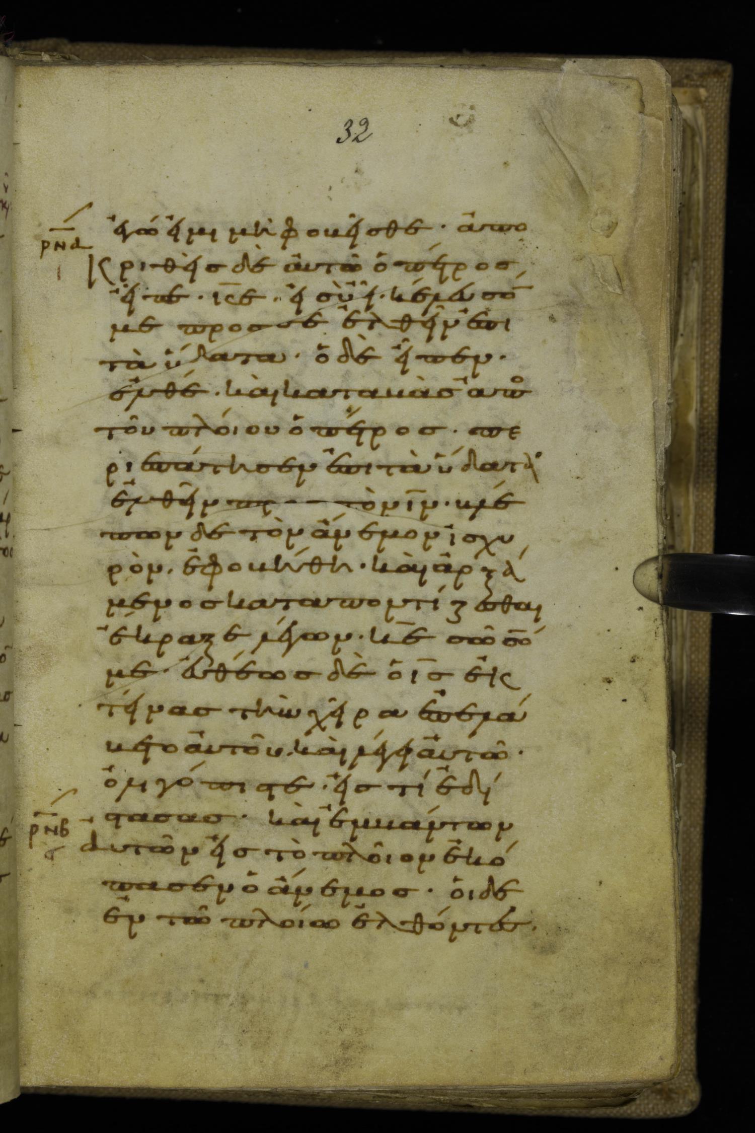 Tenth century minuscule of the Gospels on parchment; 220 leaves, 1 column, 20-21 lines per column. Images were taken at the National Library of Greece in Athens.