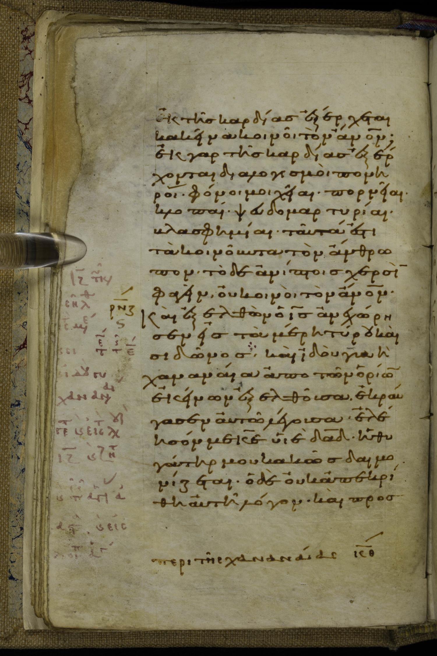 Tenth century minuscule of the Gospels on parchment; 220 leaves, 1 column, 20-21 lines per column. Images were taken at the National Library of Greece in Athens.