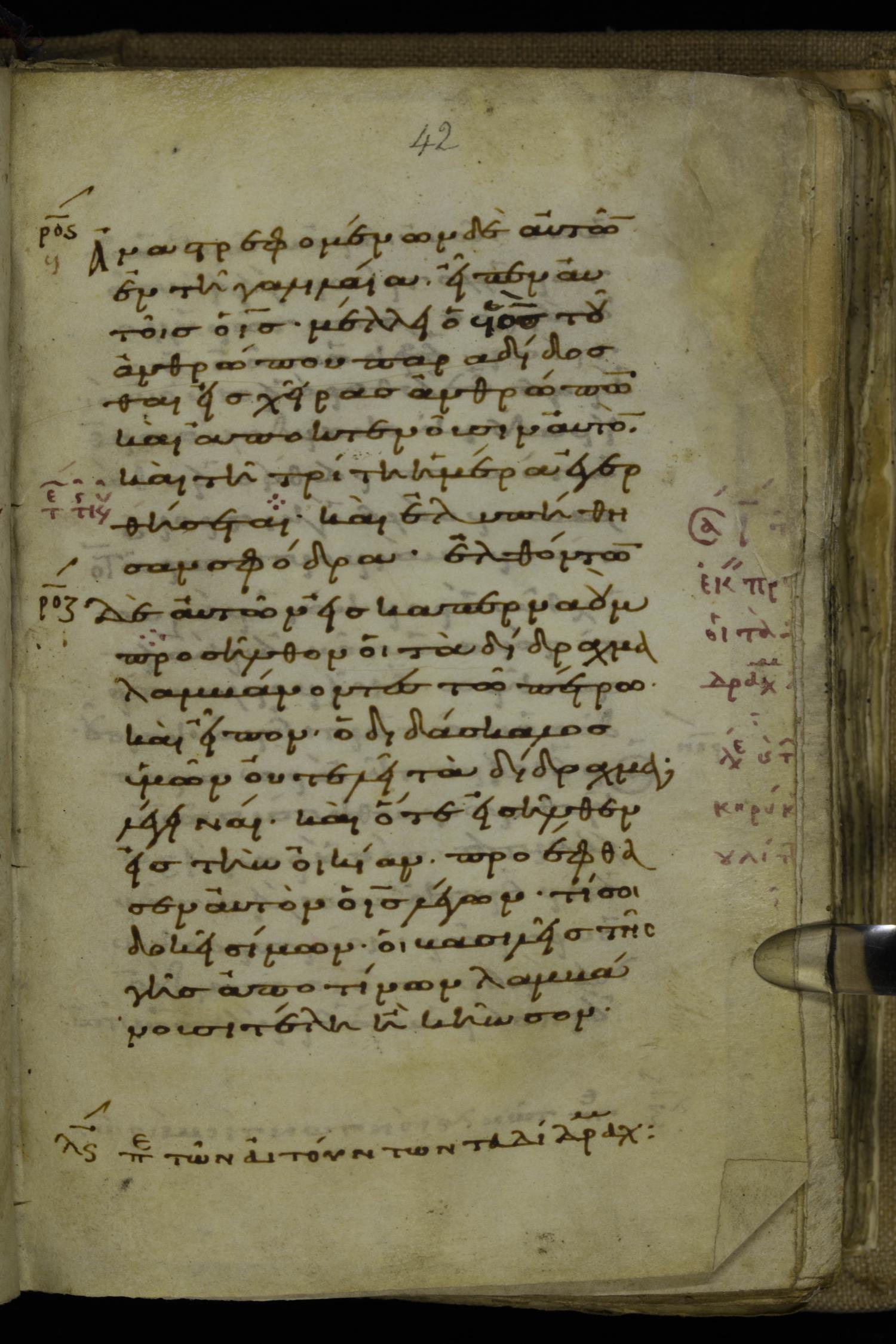 Tenth century minuscule of the Gospels on parchment; 220 leaves, 1 column, 20-21 lines per column. Images were taken at the National Library of Greece in Athens.