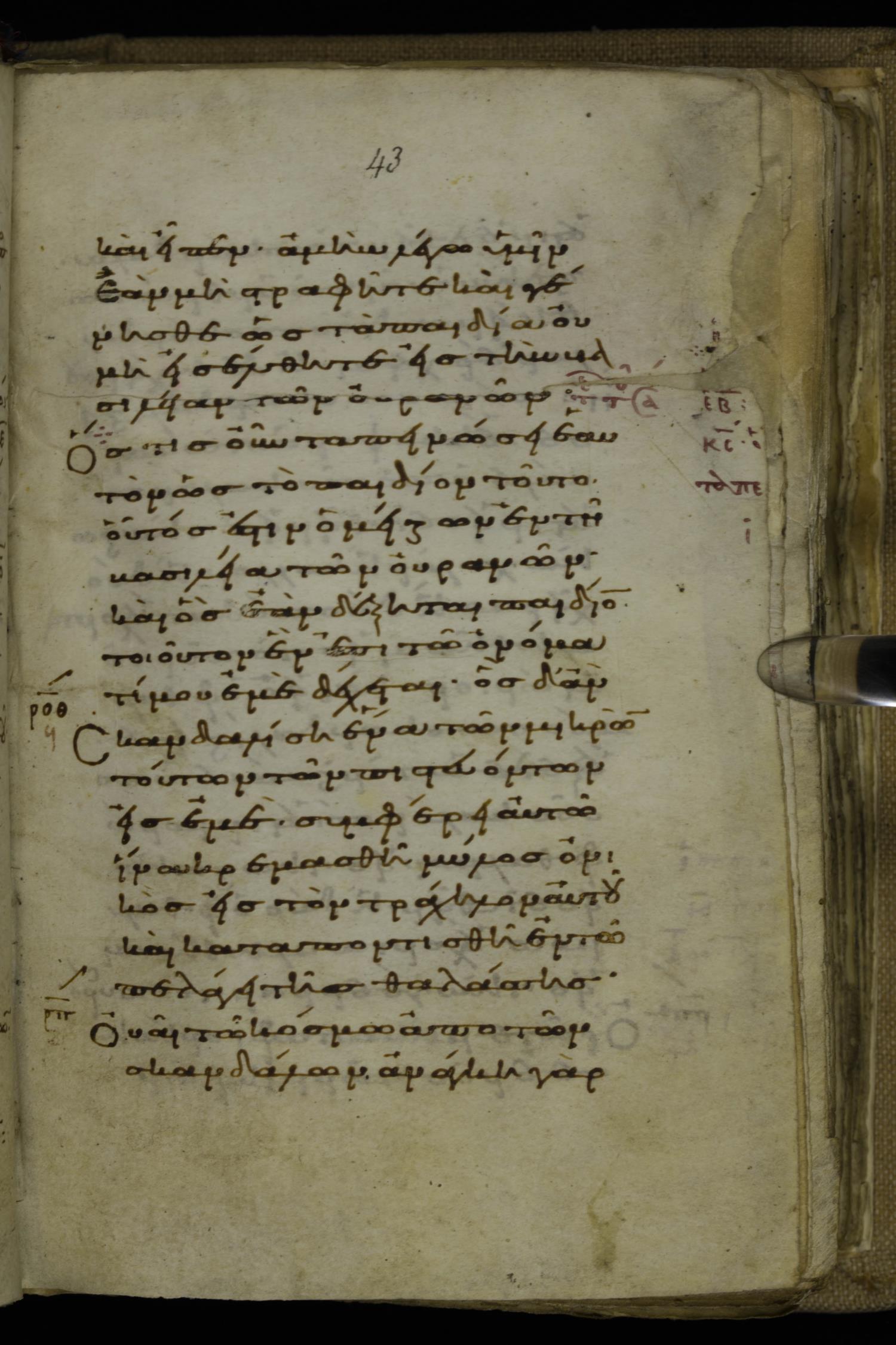 Tenth century minuscule of the Gospels on parchment; 220 leaves, 1 column, 20-21 lines per column. Images were taken at the National Library of Greece in Athens.