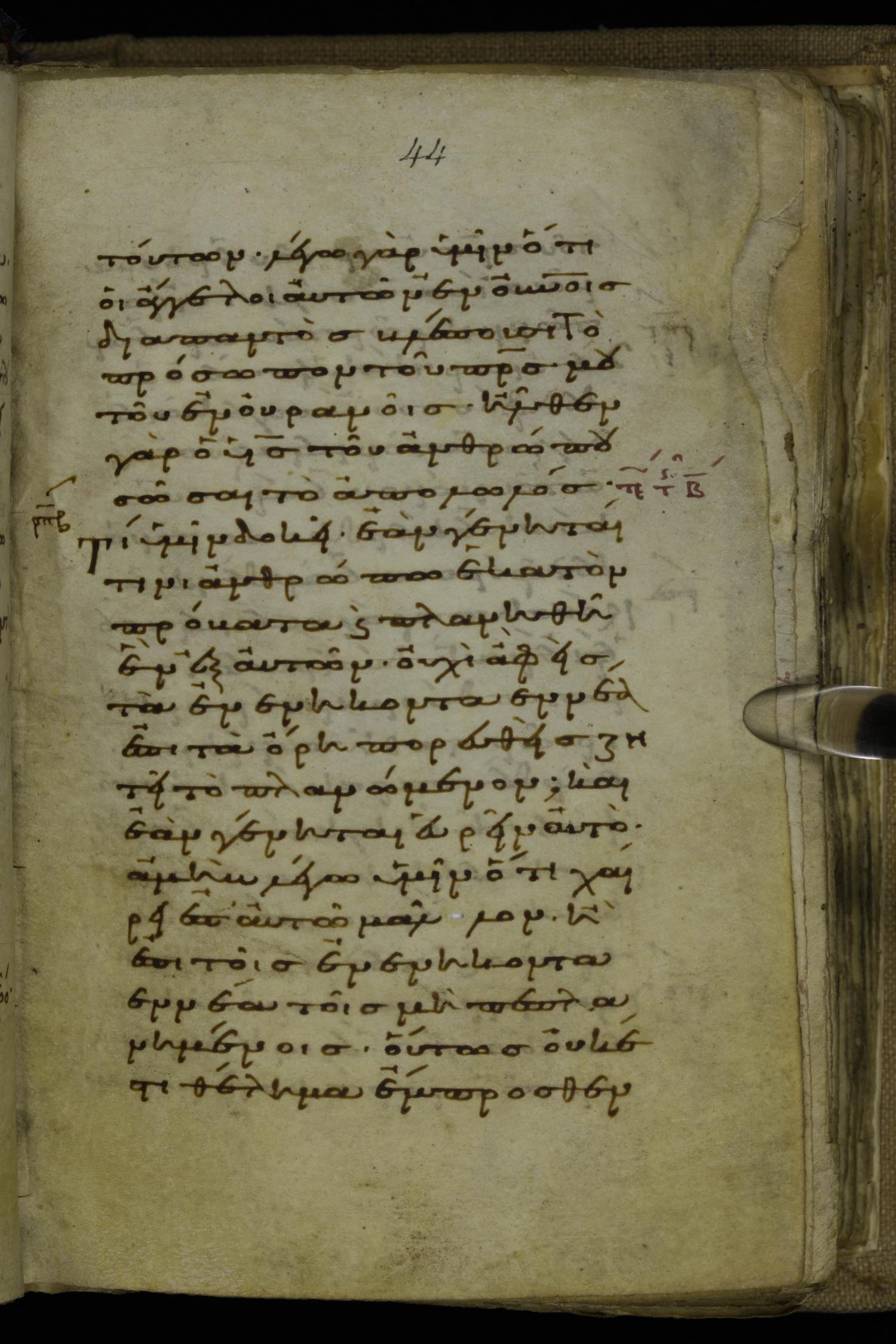Tenth century minuscule of the Gospels on parchment; 220 leaves, 1 column, 20-21 lines per column. Images were taken at the National Library of Greece in Athens.