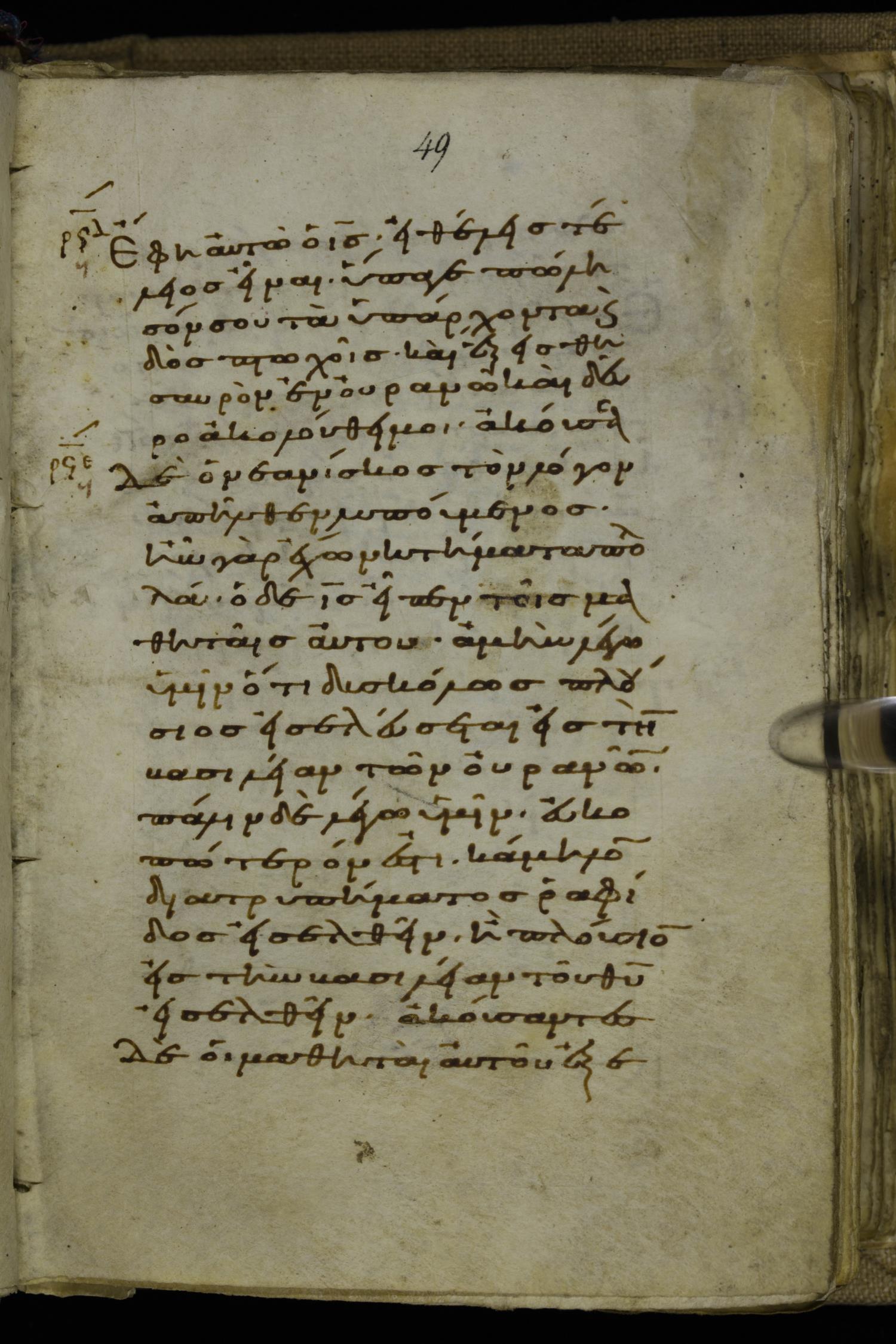 Tenth century minuscule of the Gospels on parchment; 220 leaves, 1 column, 20-21 lines per column. Images were taken at the National Library of Greece in Athens.