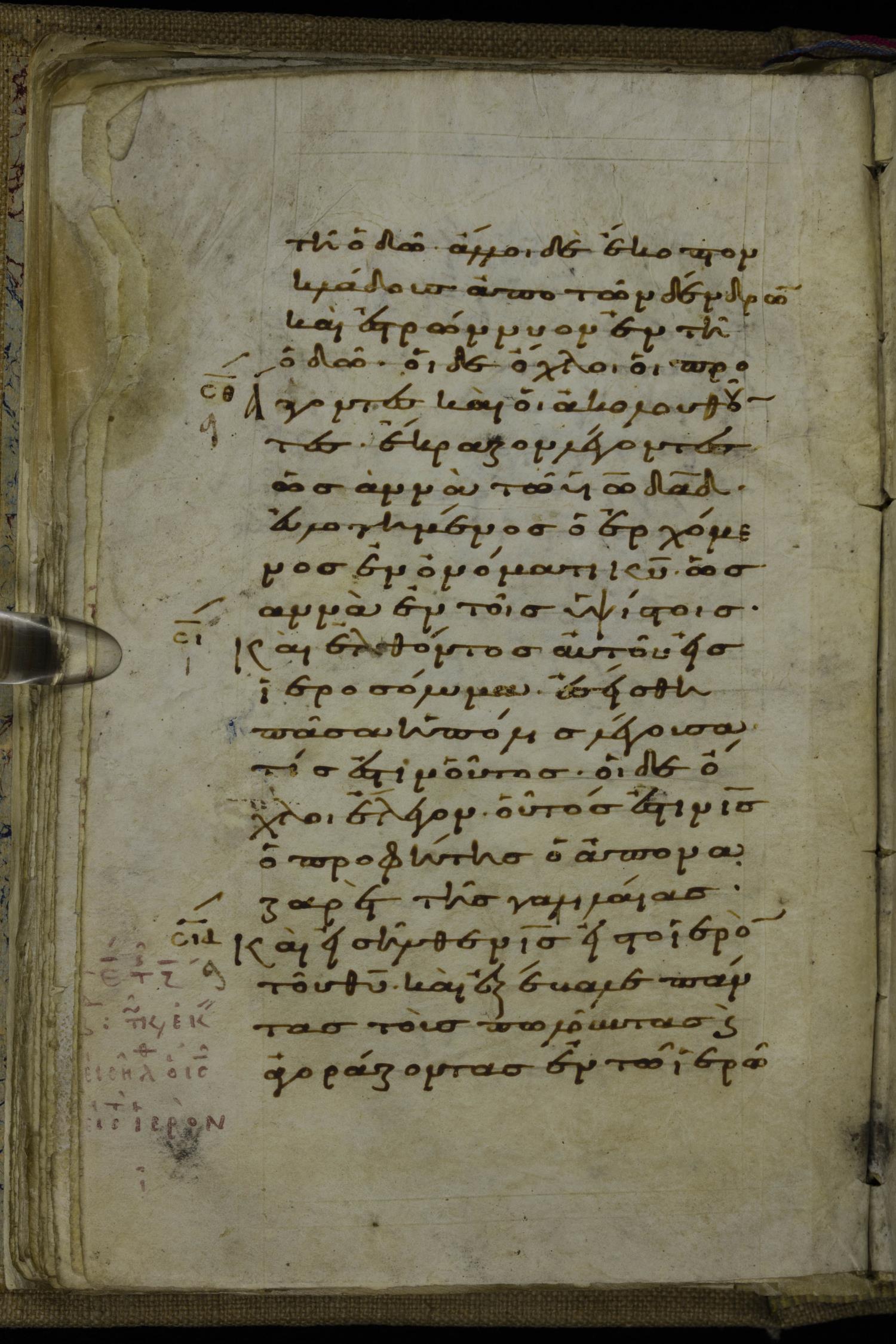 Tenth century minuscule of the Gospels on parchment; 220 leaves, 1 column, 20-21 lines per column. Images were taken at the National Library of Greece in Athens.