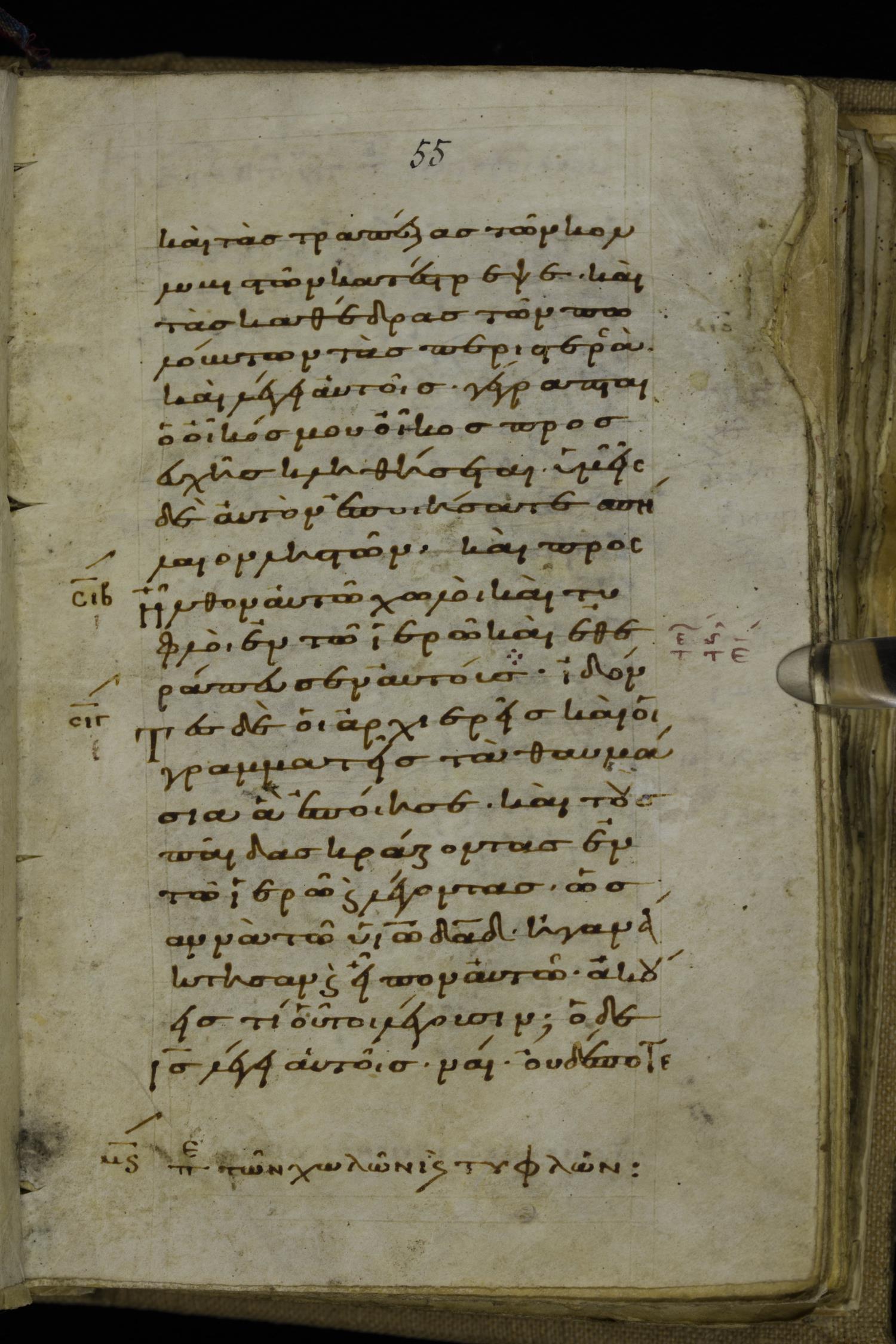 Tenth century minuscule of the Gospels on parchment; 220 leaves, 1 column, 20-21 lines per column. Images were taken at the National Library of Greece in Athens.