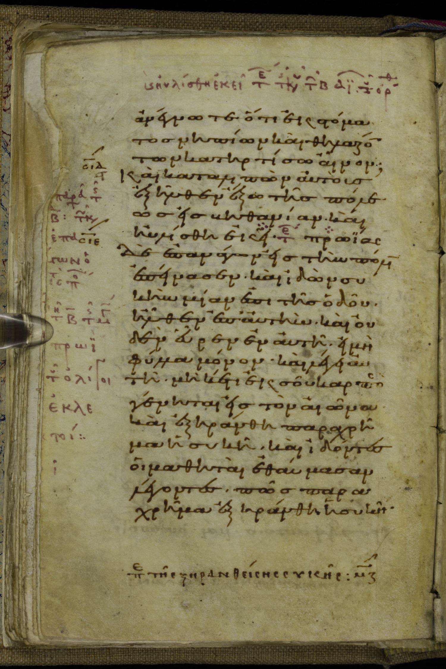 Tenth century minuscule of the Gospels on parchment; 220 leaves, 1 column, 20-21 lines per column. Images were taken at the National Library of Greece in Athens.