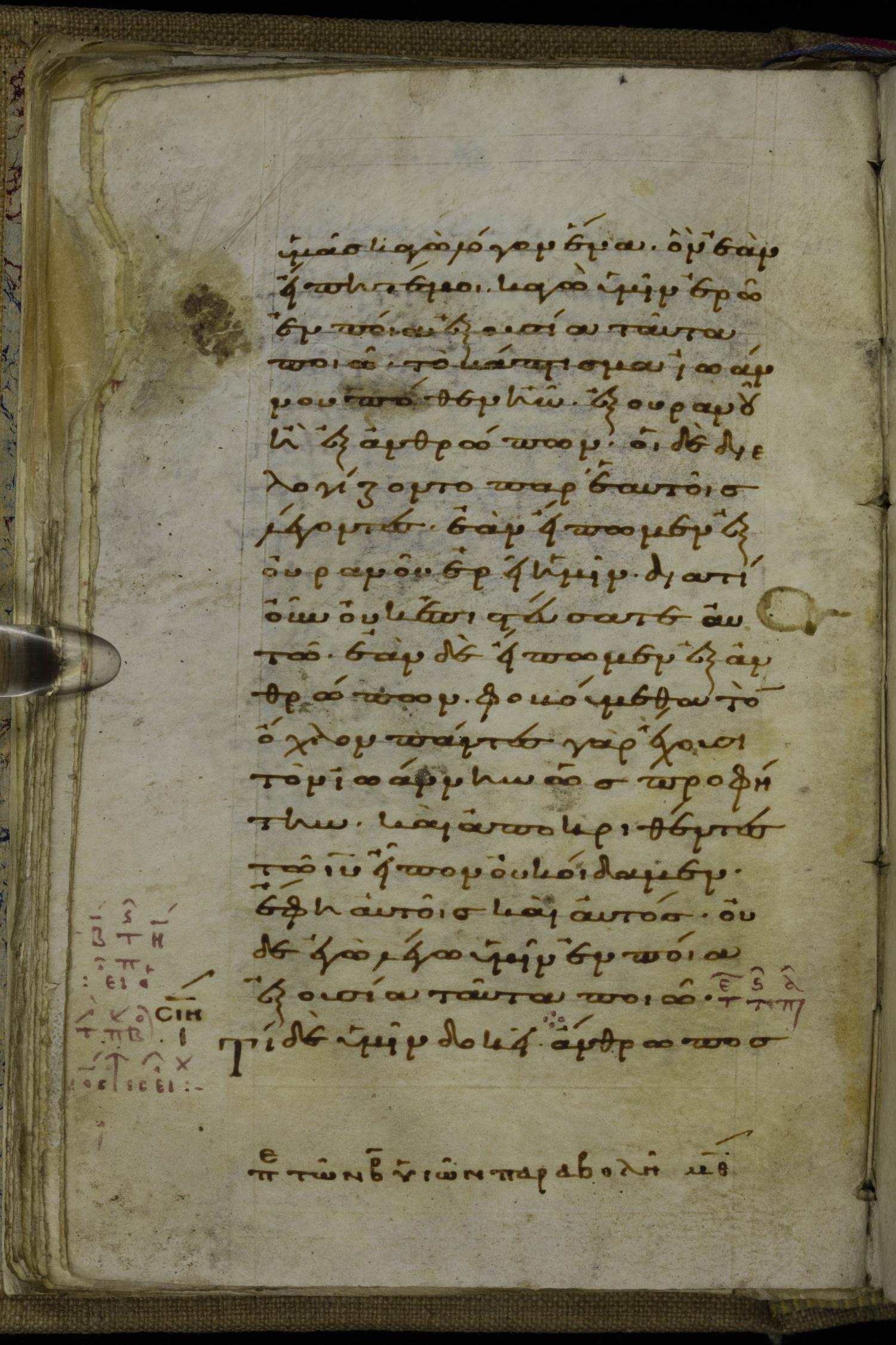 Tenth century minuscule of the Gospels on parchment; 220 leaves, 1 column, 20-21 lines per column. Images were taken at the National Library of Greece in Athens.