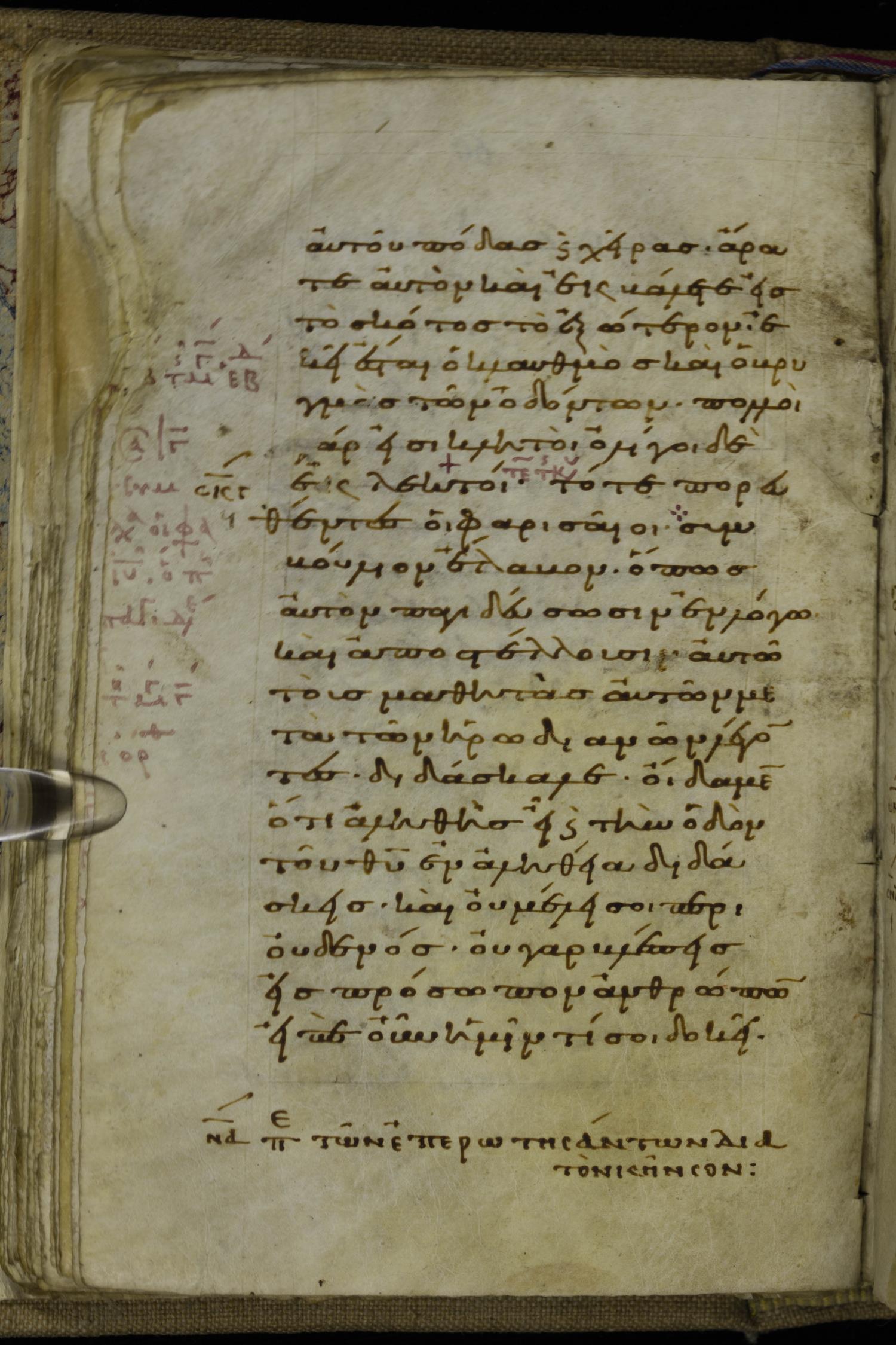 Tenth century minuscule of the Gospels on parchment; 220 leaves, 1 column, 20-21 lines per column. Images were taken at the National Library of Greece in Athens.
