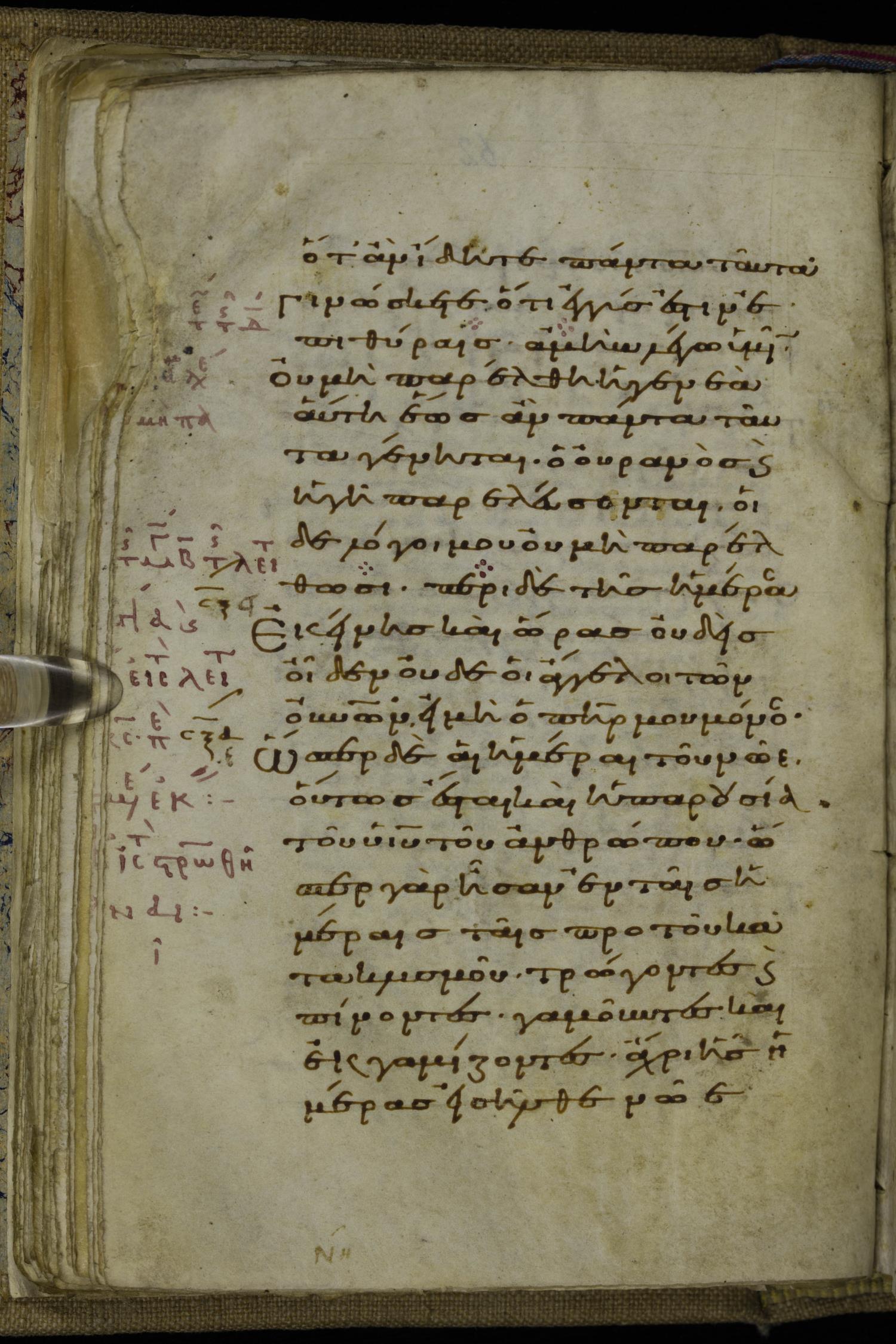 Tenth century minuscule of the Gospels on parchment; 220 leaves, 1 column, 20-21 lines per column. Images were taken at the National Library of Greece in Athens.