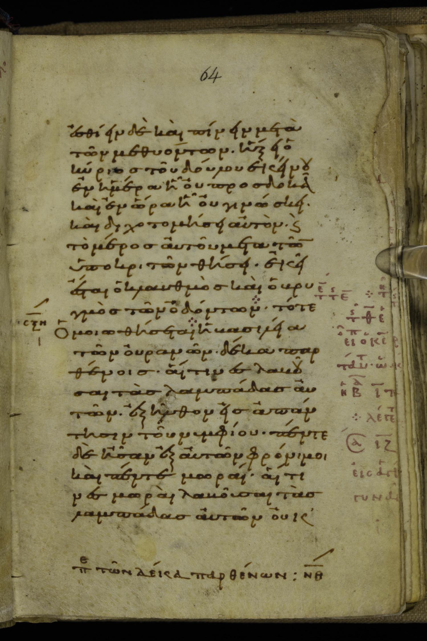 Tenth century minuscule of the Gospels on parchment; 220 leaves, 1 column, 20-21 lines per column. Images were taken at the National Library of Greece in Athens.