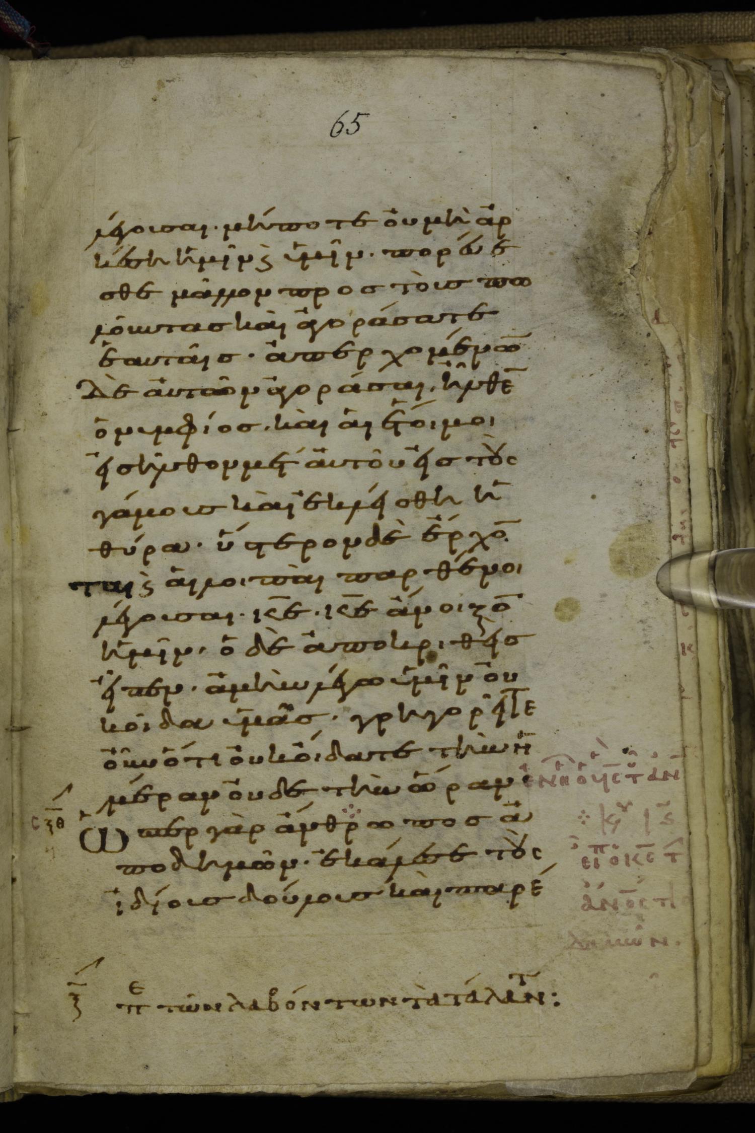 Tenth century minuscule of the Gospels on parchment; 220 leaves, 1 column, 20-21 lines per column. Images were taken at the National Library of Greece in Athens.