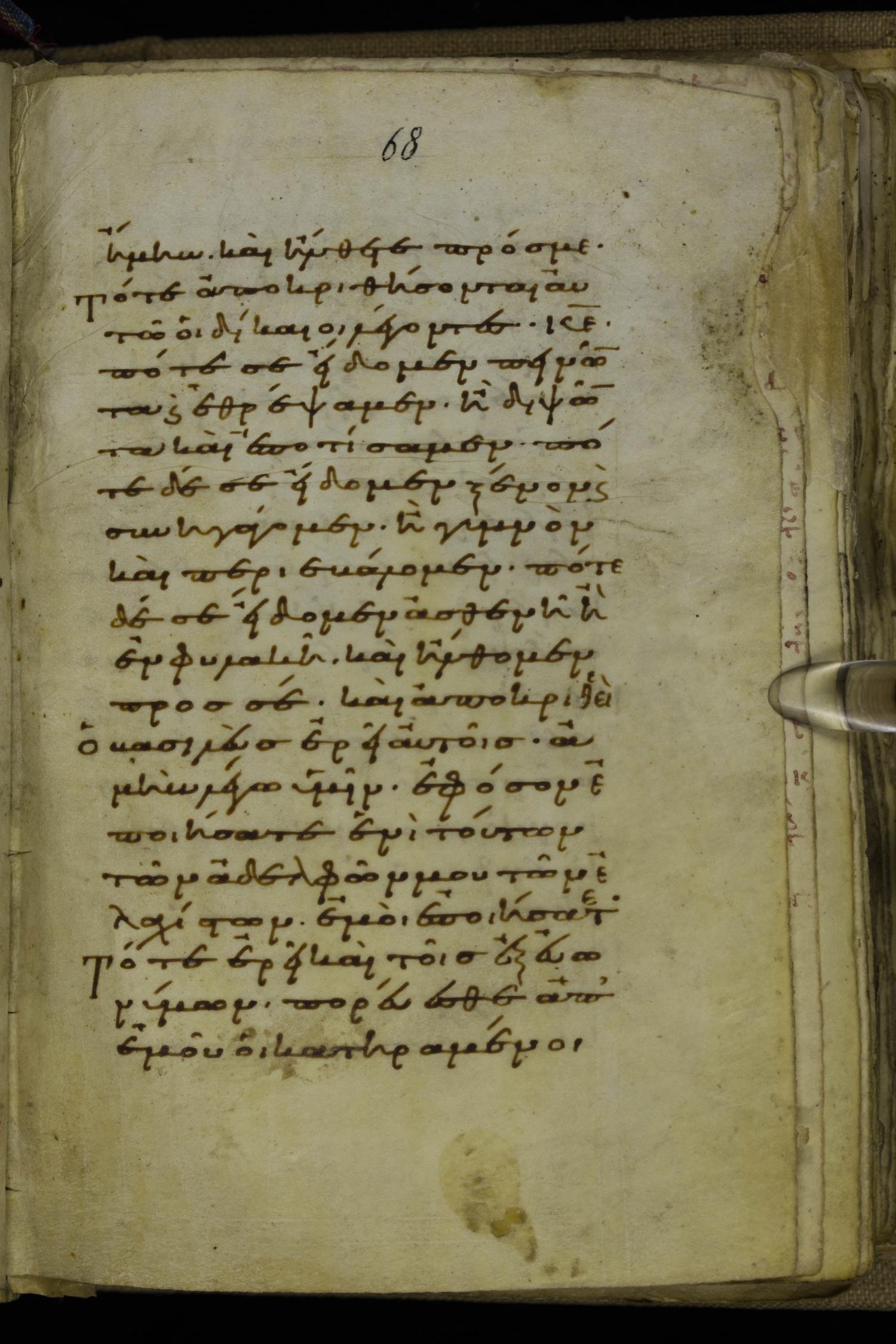 Tenth century minuscule of the Gospels on parchment; 220 leaves, 1 column, 20-21 lines per column. Images were taken at the National Library of Greece in Athens.