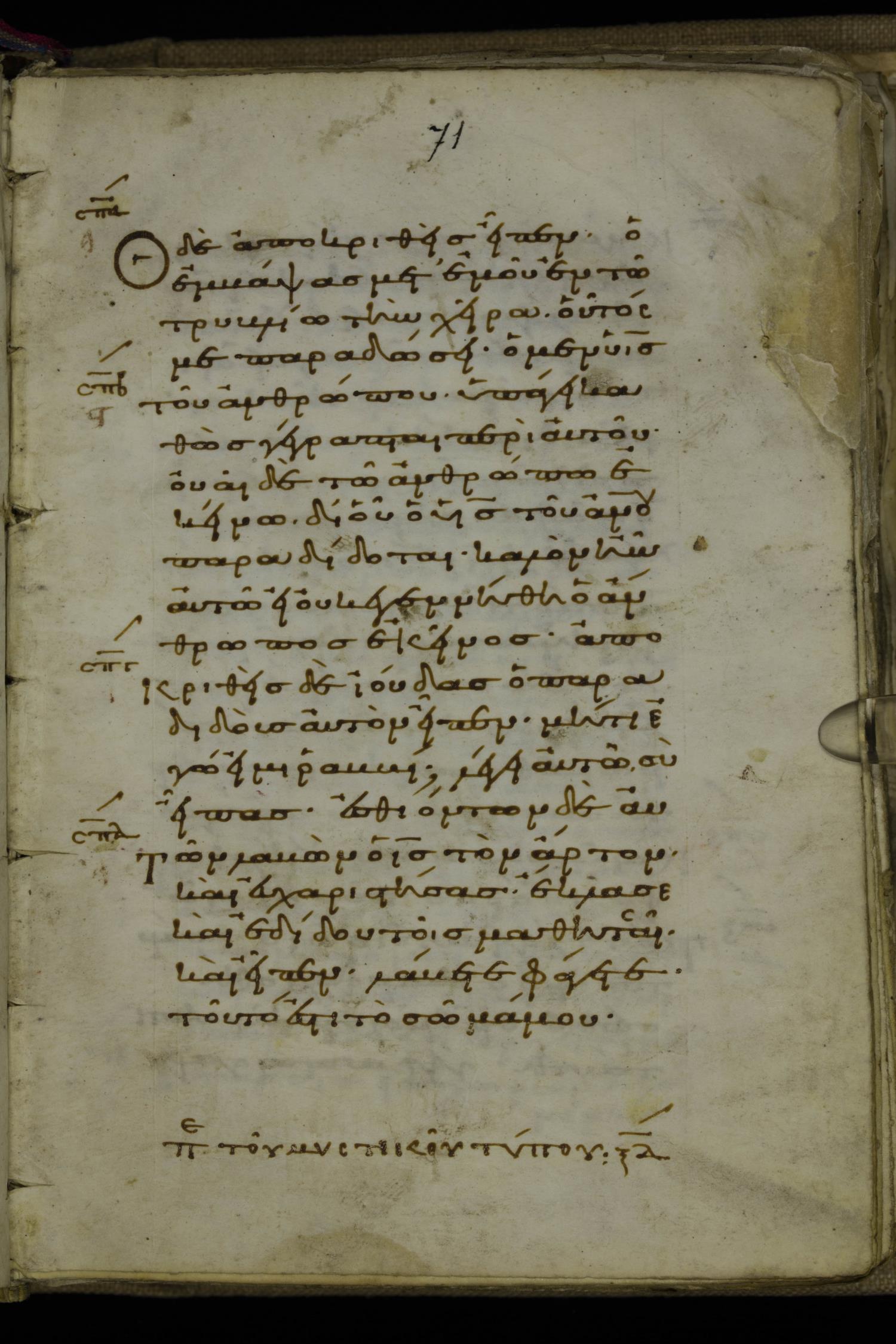 Tenth century minuscule of the Gospels on parchment; 220 leaves, 1 column, 20-21 lines per column. Images were taken at the National Library of Greece in Athens.