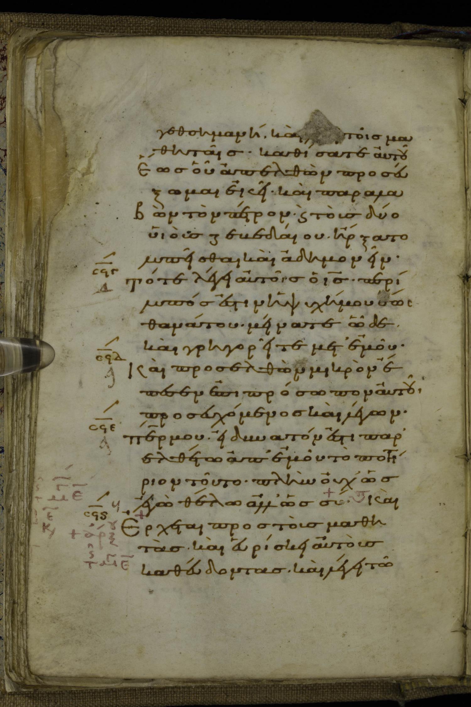 Tenth century minuscule of the Gospels on parchment; 220 leaves, 1 column, 20-21 lines per column. Images were taken at the National Library of Greece in Athens.