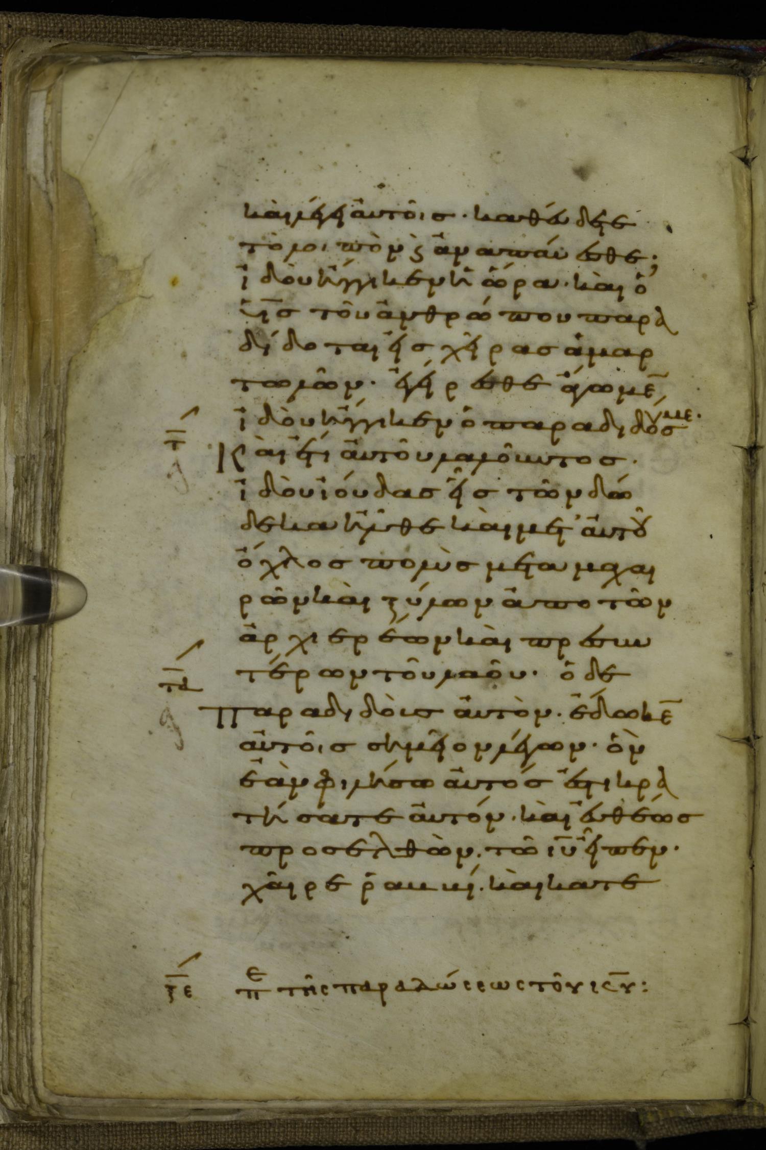 Tenth century minuscule of the Gospels on parchment; 220 leaves, 1 column, 20-21 lines per column. Images were taken at the National Library of Greece in Athens.