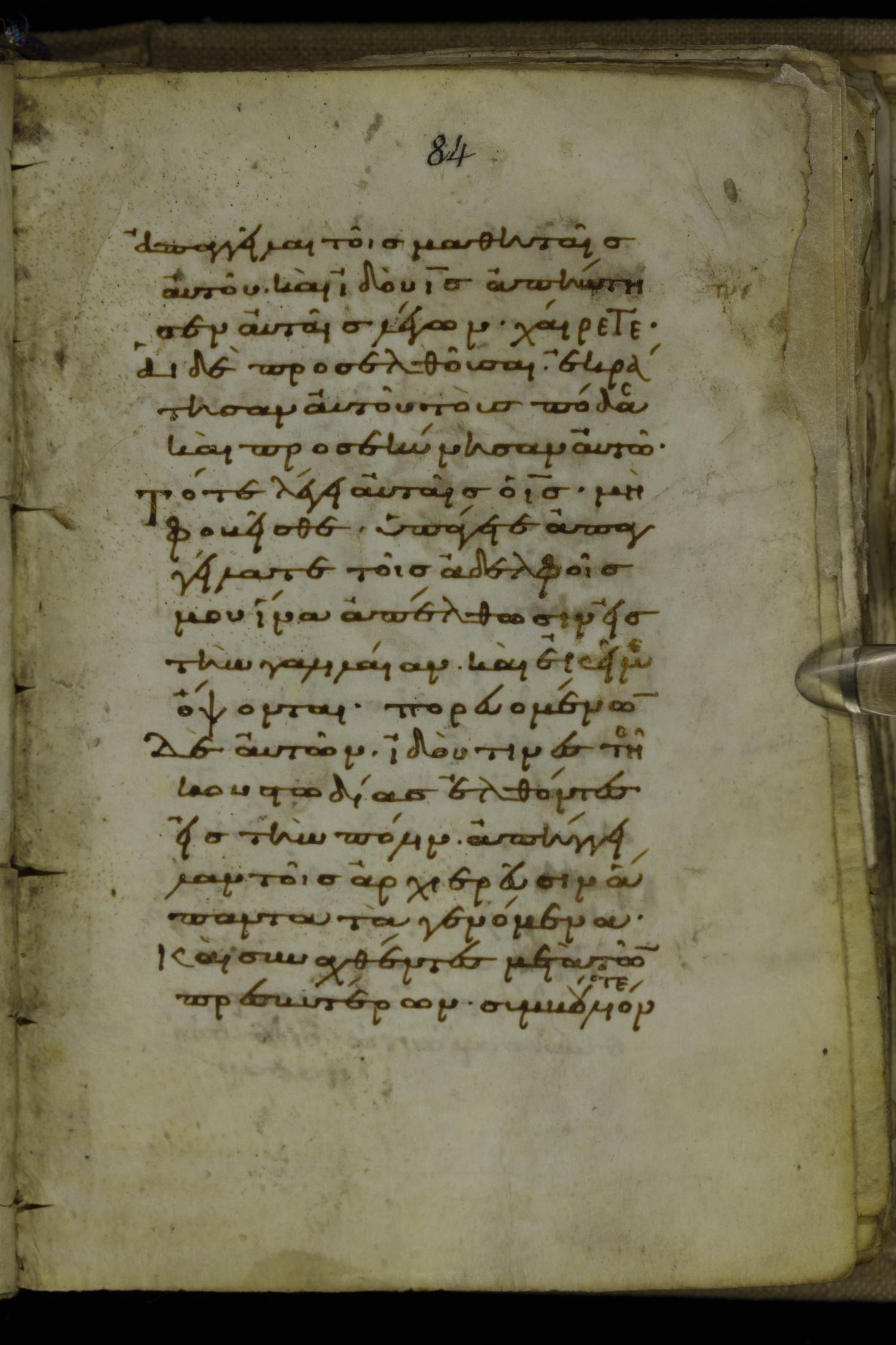 Tenth century minuscule of the Gospels on parchment; 220 leaves, 1 column, 20-21 lines per column. Images were taken at the National Library of Greece in Athens.
