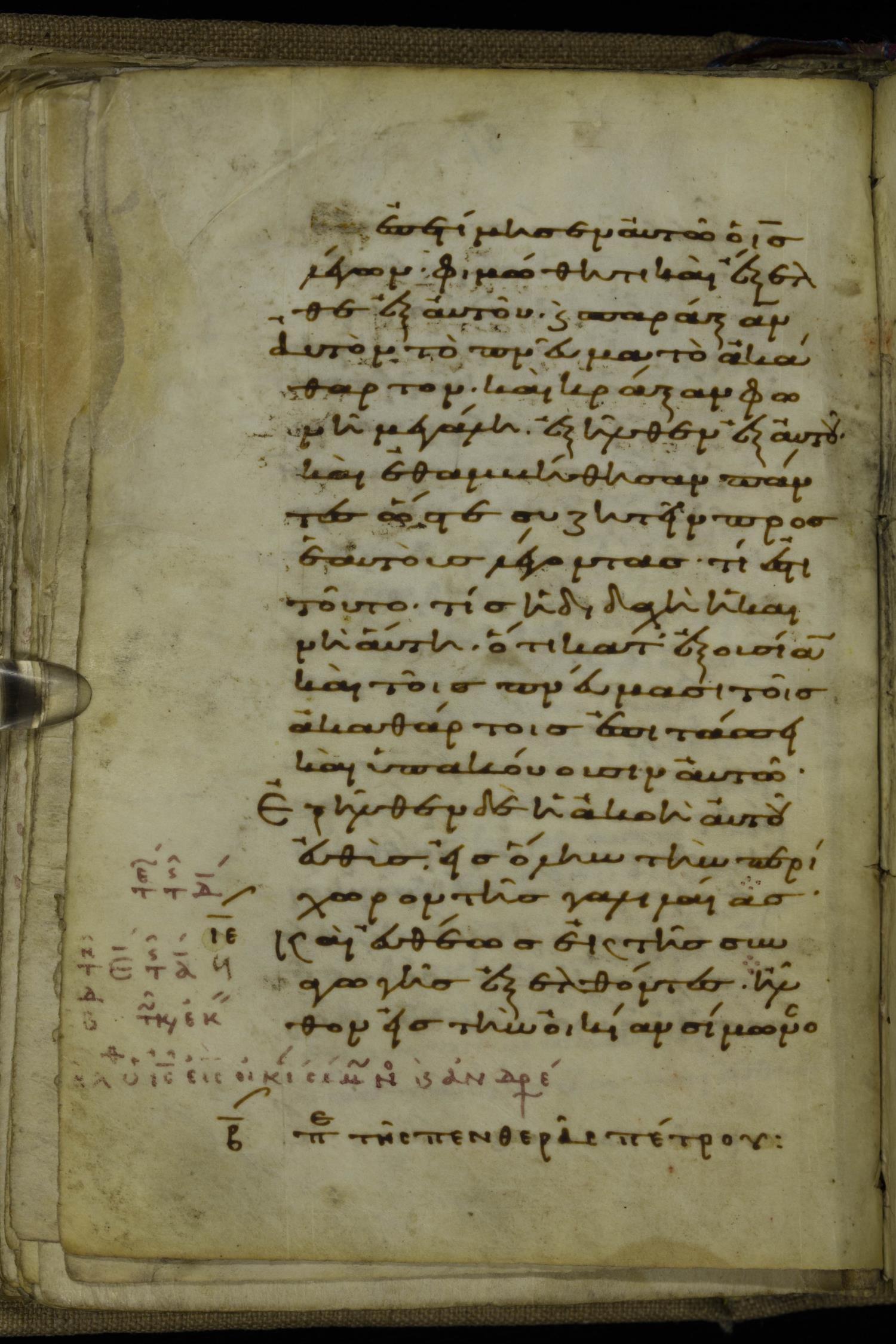 Tenth century minuscule of the Gospels on parchment; 220 leaves, 1 column, 20-21 lines per column. Images were taken at the National Library of Greece in Athens.