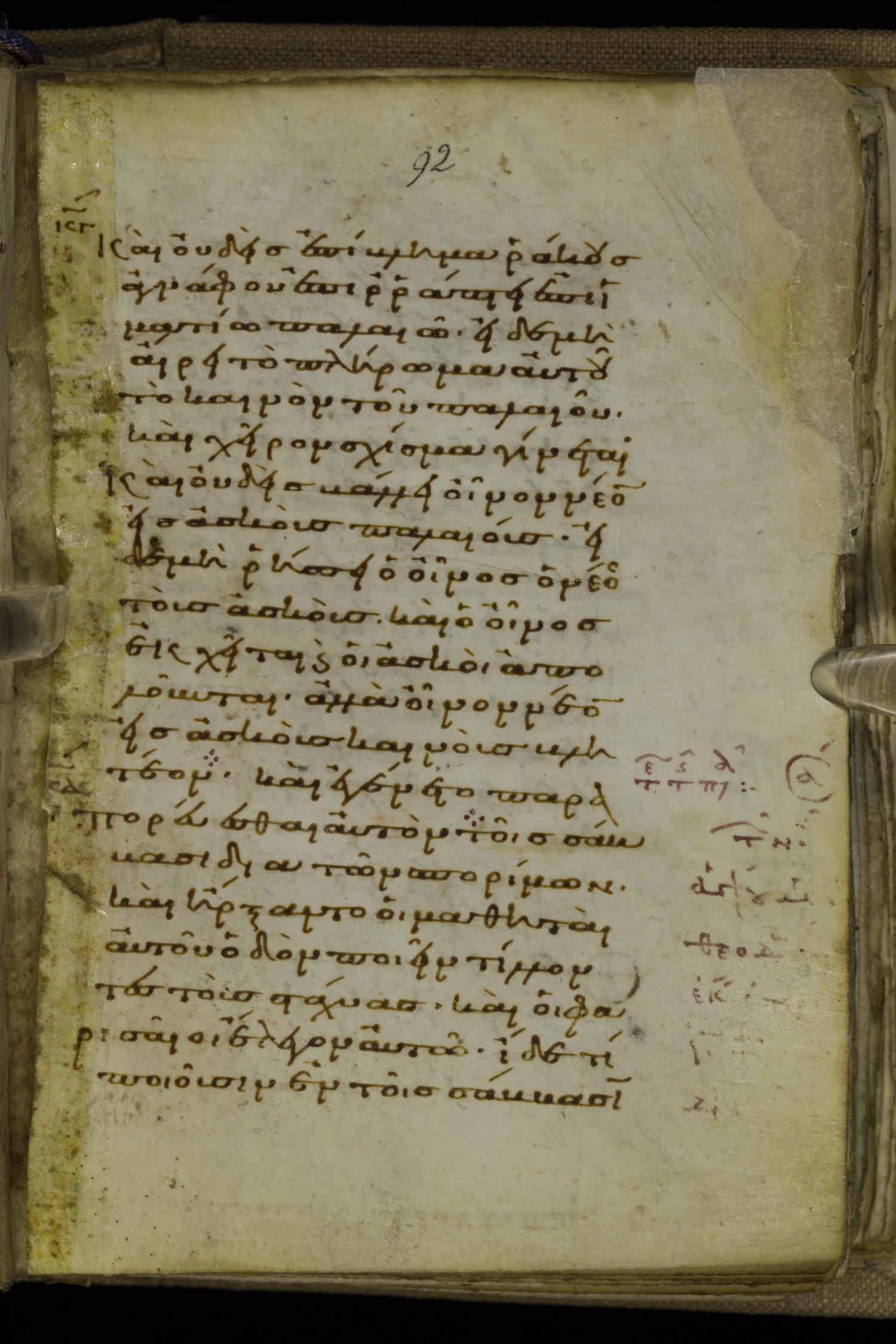 Tenth century minuscule of the Gospels on parchment; 220 leaves, 1 column, 20-21 lines per column. Images were taken at the National Library of Greece in Athens.