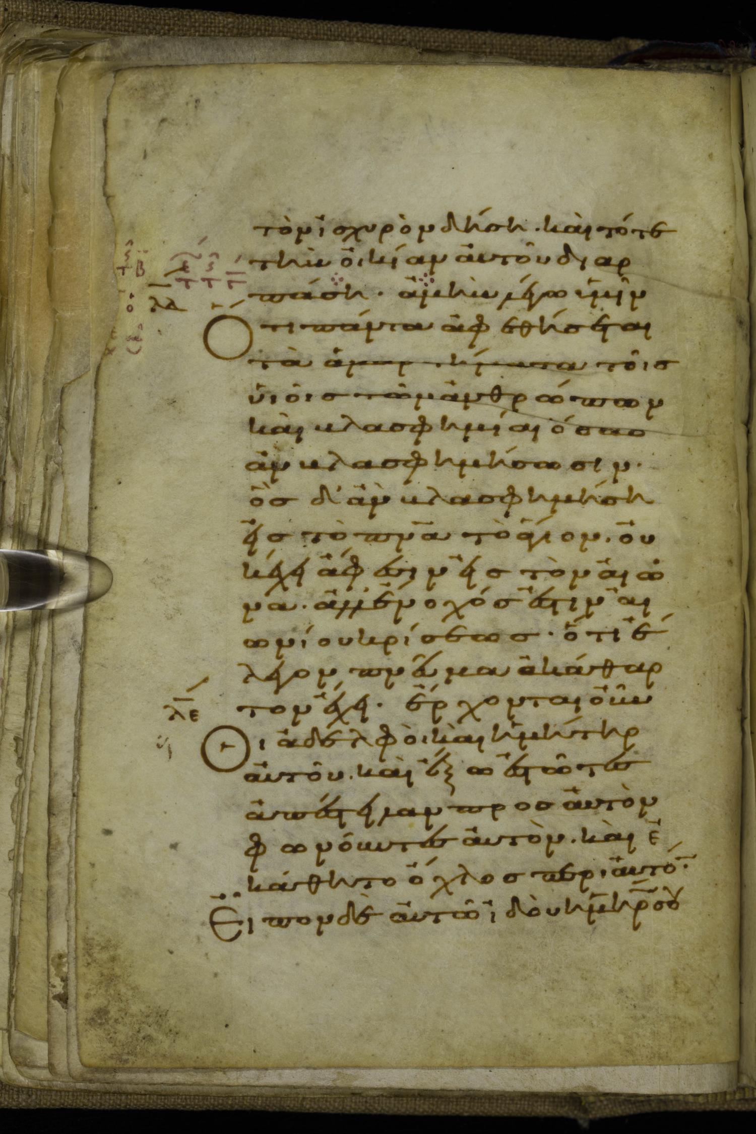 Tenth century minuscule of the Gospels on parchment; 220 leaves, 1 column, 20-21 lines per column. Images were taken at the National Library of Greece in Athens.