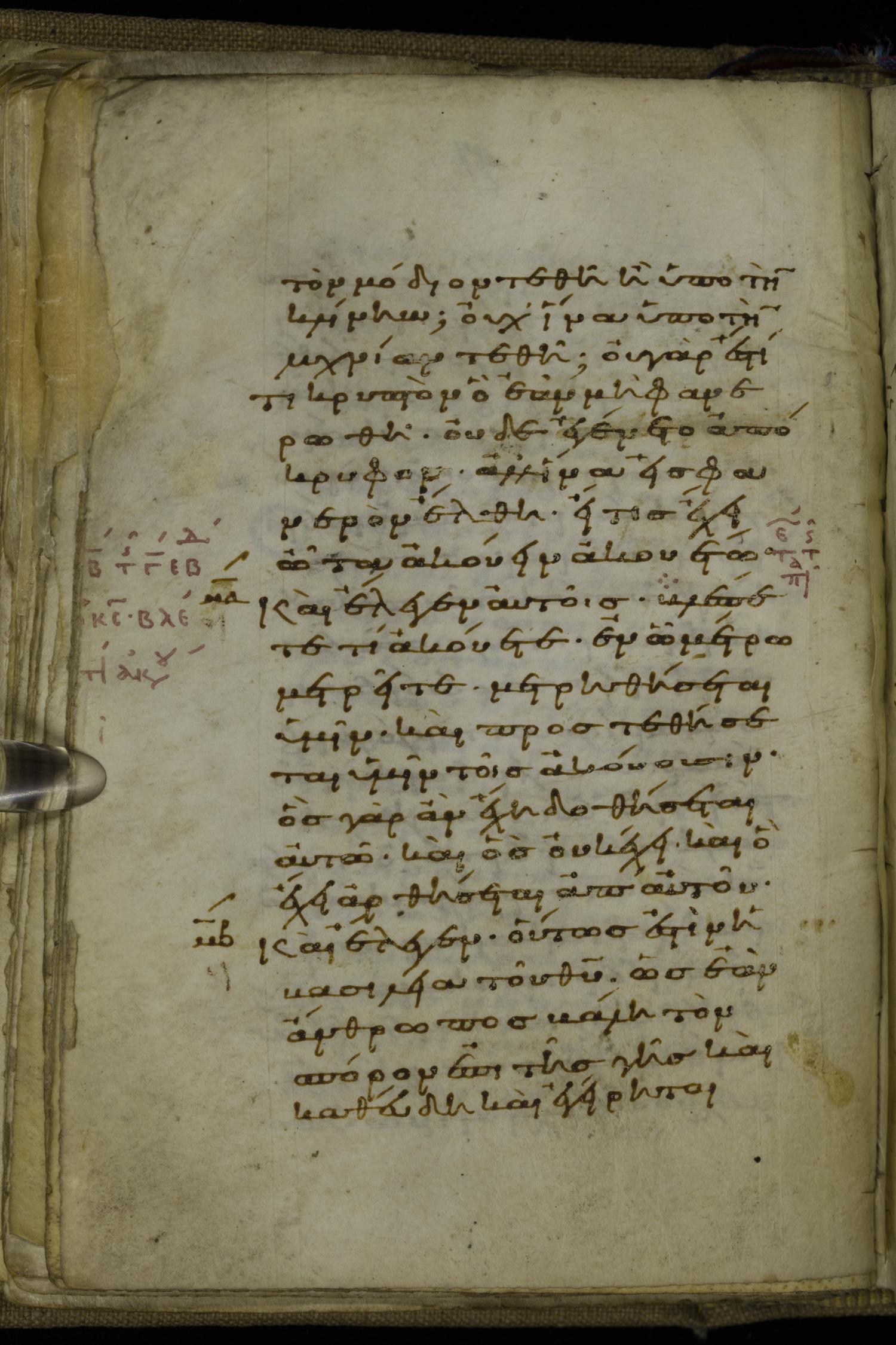 Tenth century minuscule of the Gospels on parchment; 220 leaves, 1 column, 20-21 lines per column. Images were taken at the National Library of Greece in Athens.