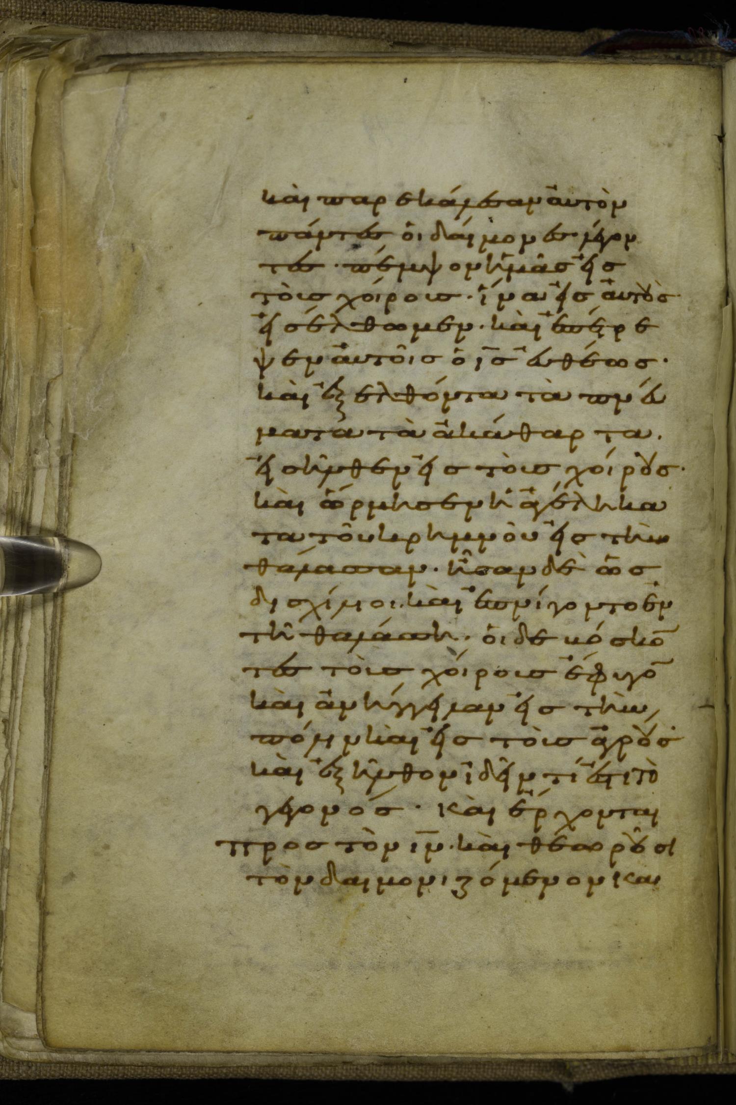 Tenth century minuscule of the Gospels on parchment; 220 leaves, 1 column, 20-21 lines per column. Images were taken at the National Library of Greece in Athens.
