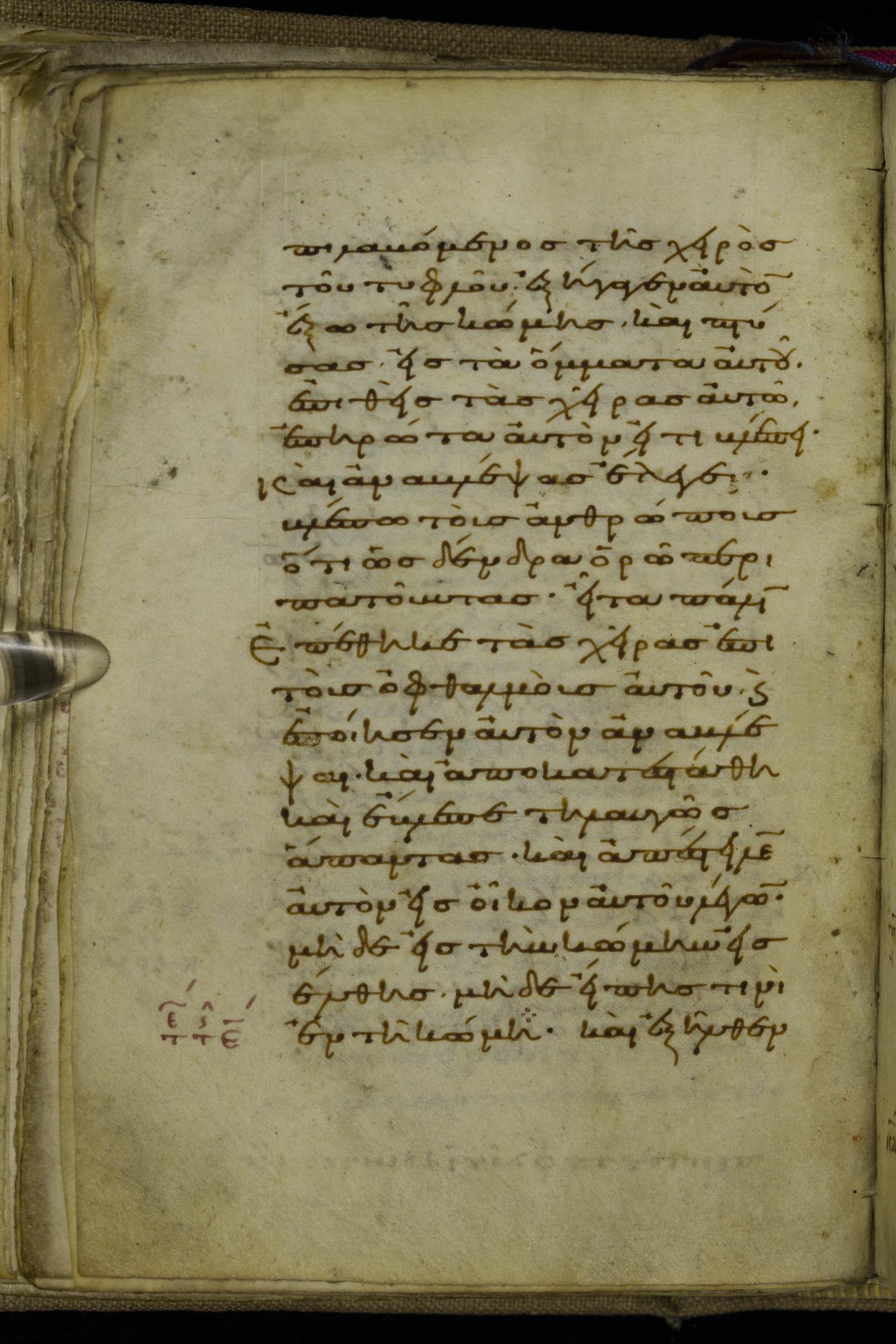 Tenth century minuscule of the Gospels on parchment; 220 leaves, 1 column, 20-21 lines per column. Images were taken at the National Library of Greece in Athens.