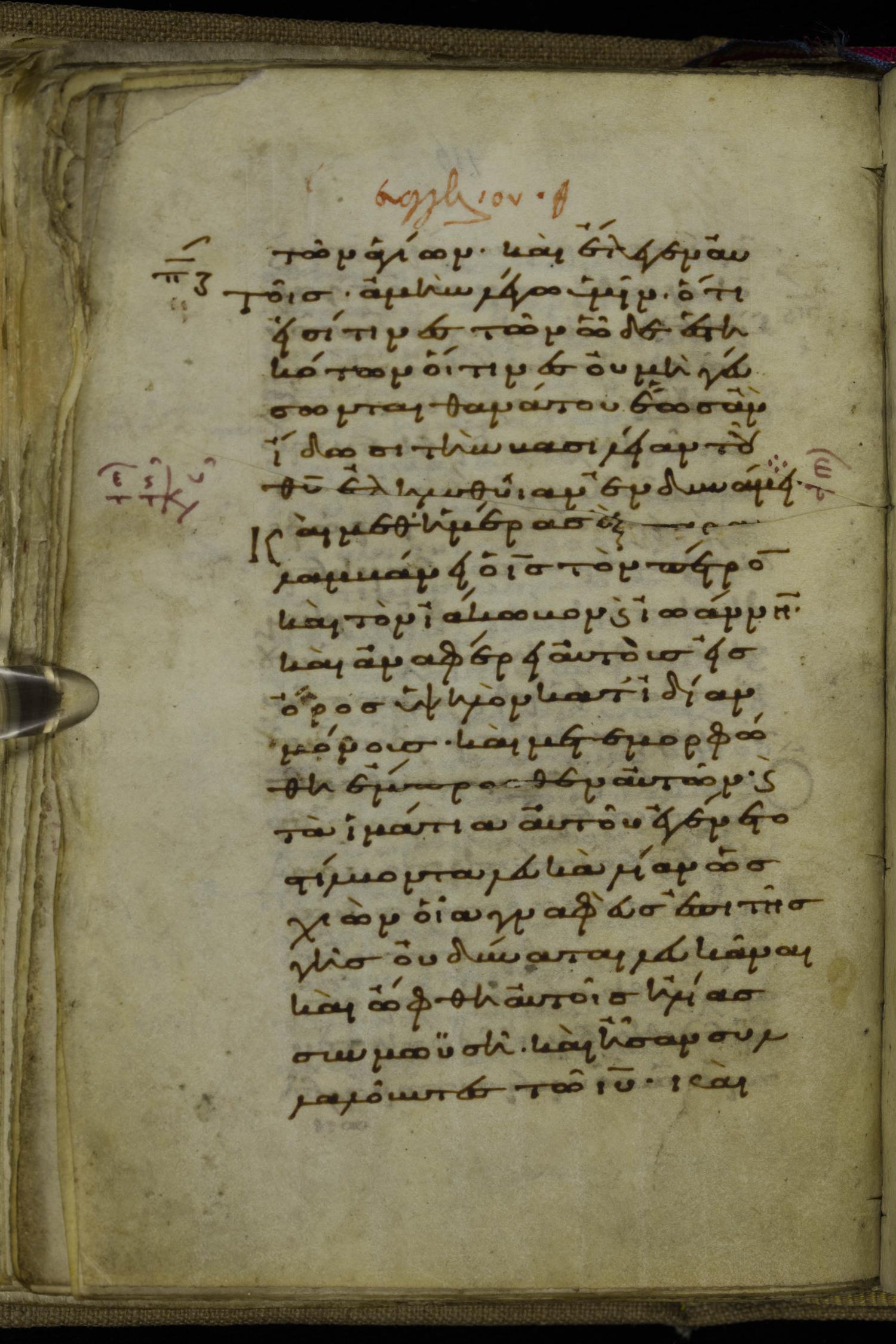 Tenth century minuscule of the Gospels on parchment; 220 leaves, 1 column, 20-21 lines per column. Images were taken at the National Library of Greece in Athens.