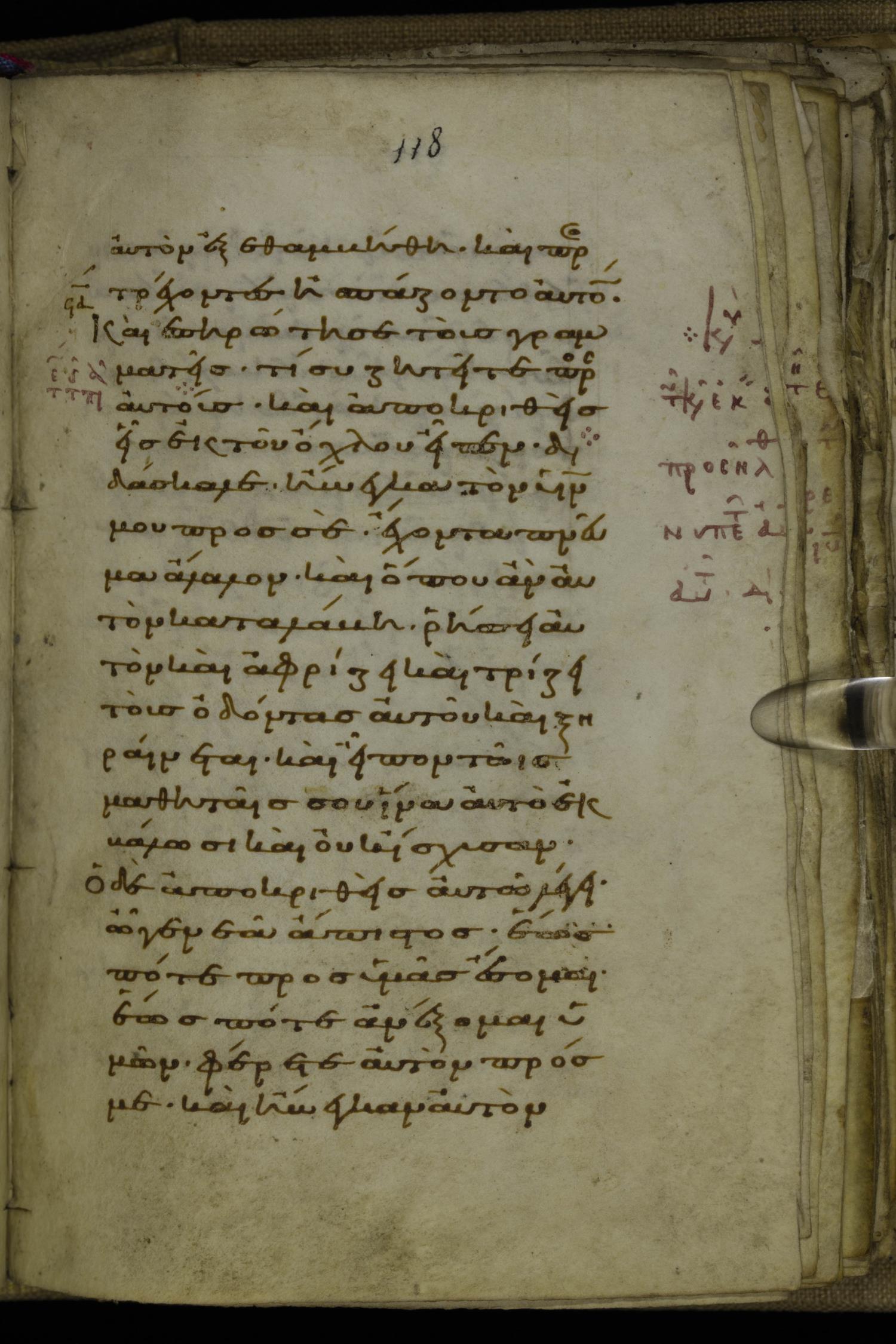 Tenth century minuscule of the Gospels on parchment; 220 leaves, 1 column, 20-21 lines per column. Images were taken at the National Library of Greece in Athens.