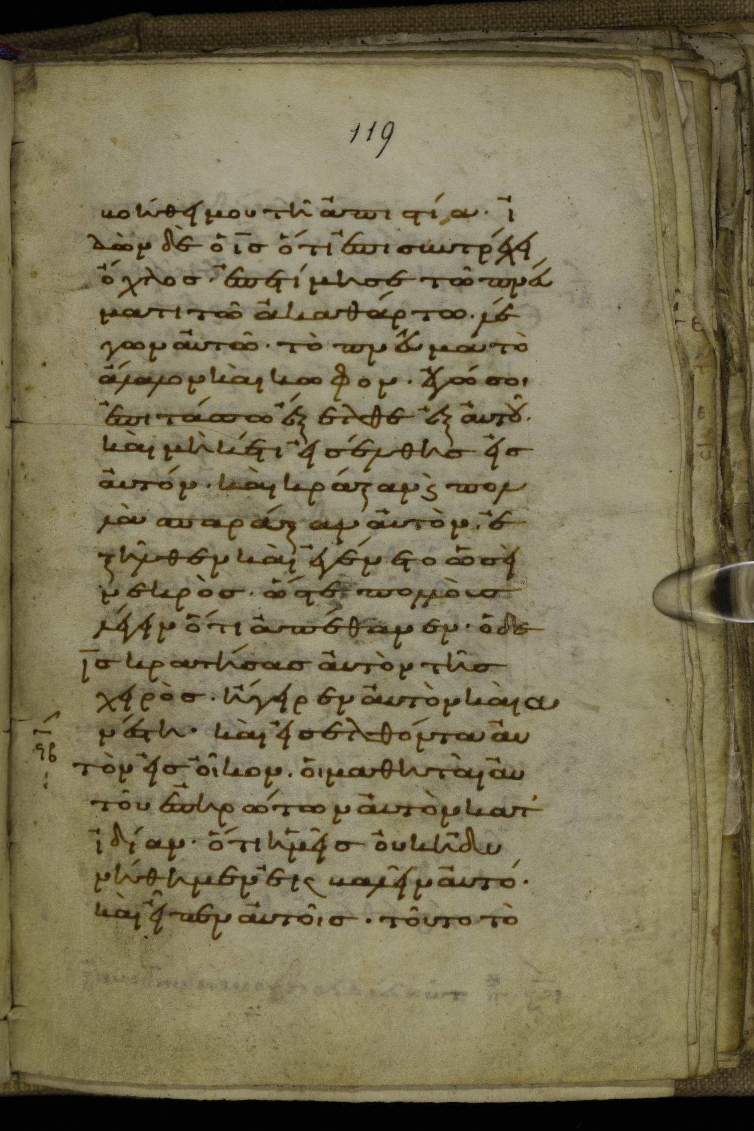 Tenth century minuscule of the Gospels on parchment; 220 leaves, 1 column, 20-21 lines per column. Images were taken at the National Library of Greece in Athens.