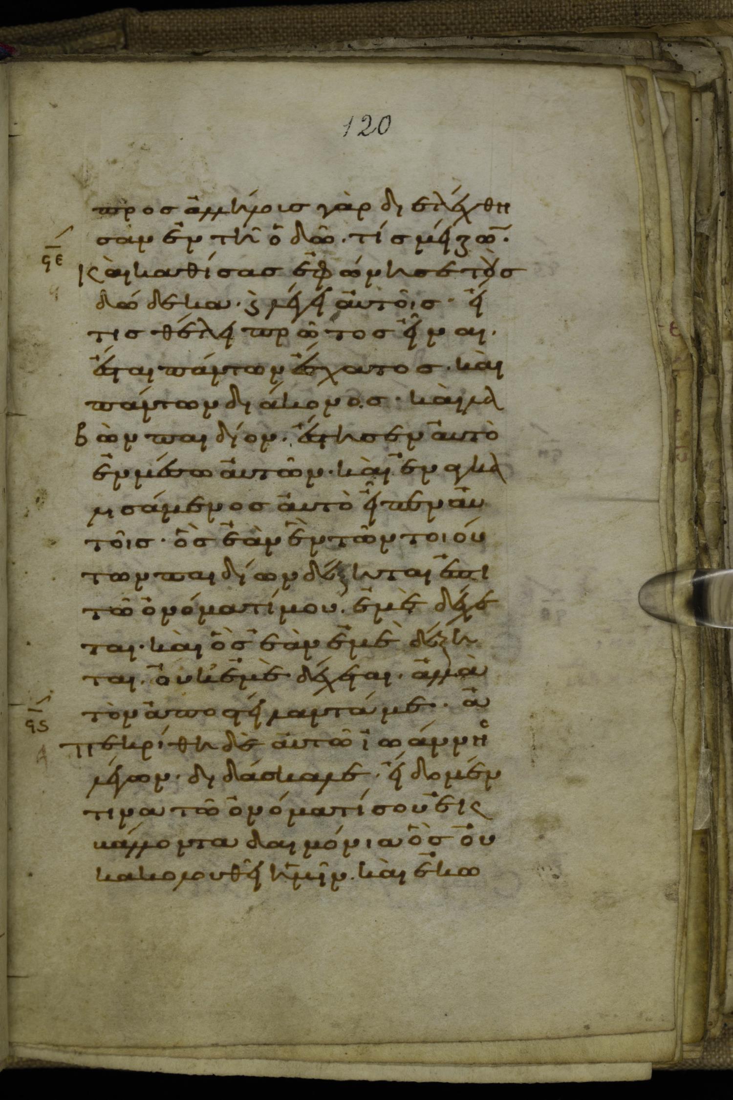 Tenth century minuscule of the Gospels on parchment; 220 leaves, 1 column, 20-21 lines per column. Images were taken at the National Library of Greece in Athens.