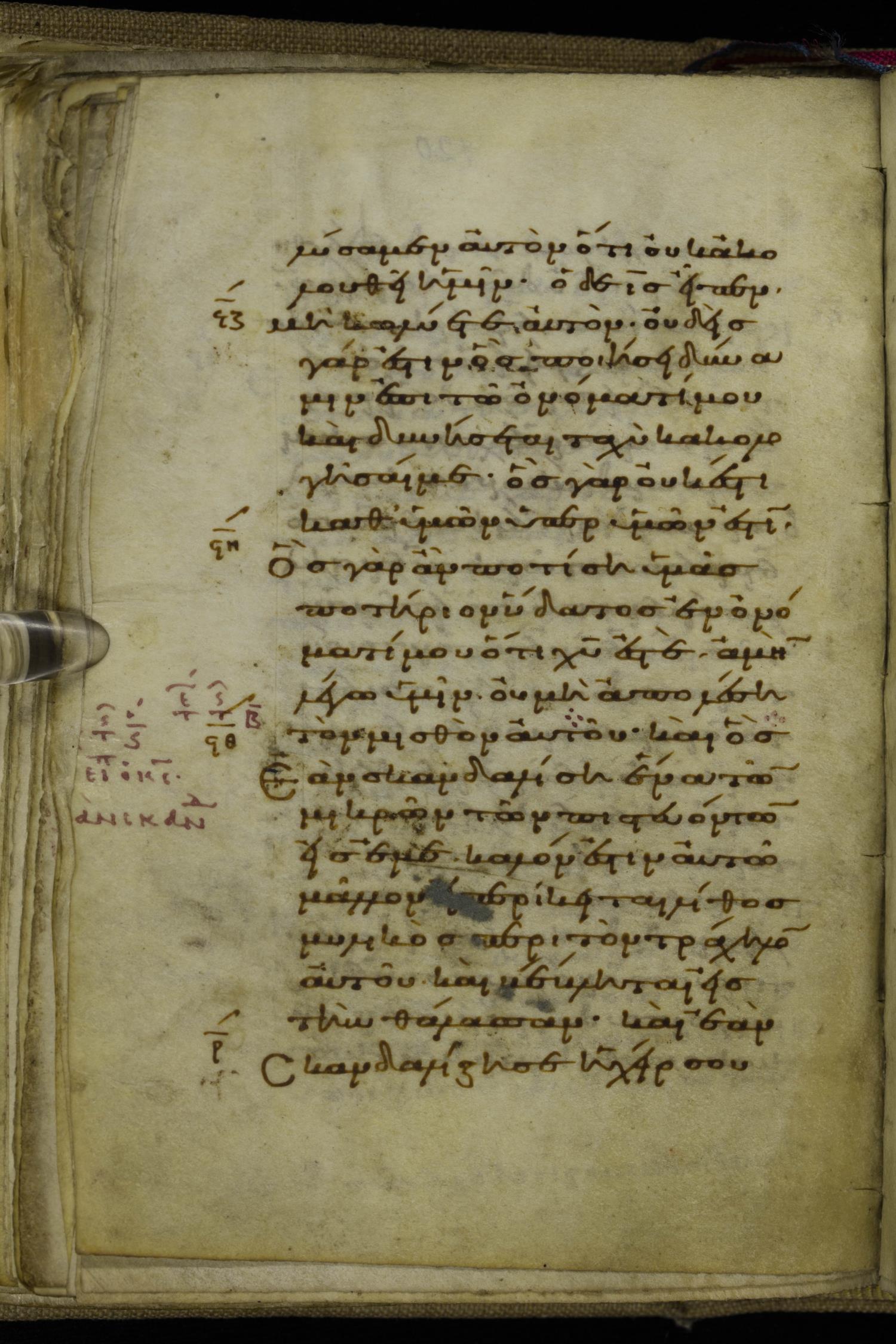 Tenth century minuscule of the Gospels on parchment; 220 leaves, 1 column, 20-21 lines per column. Images were taken at the National Library of Greece in Athens.