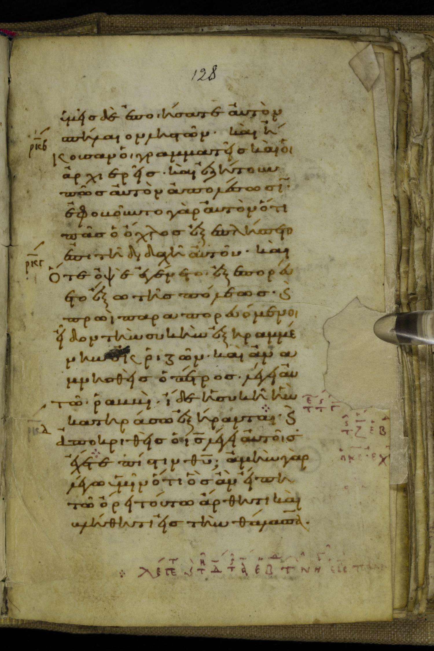 Tenth century minuscule of the Gospels on parchment; 220 leaves, 1 column, 20-21 lines per column. Images were taken at the National Library of Greece in Athens.