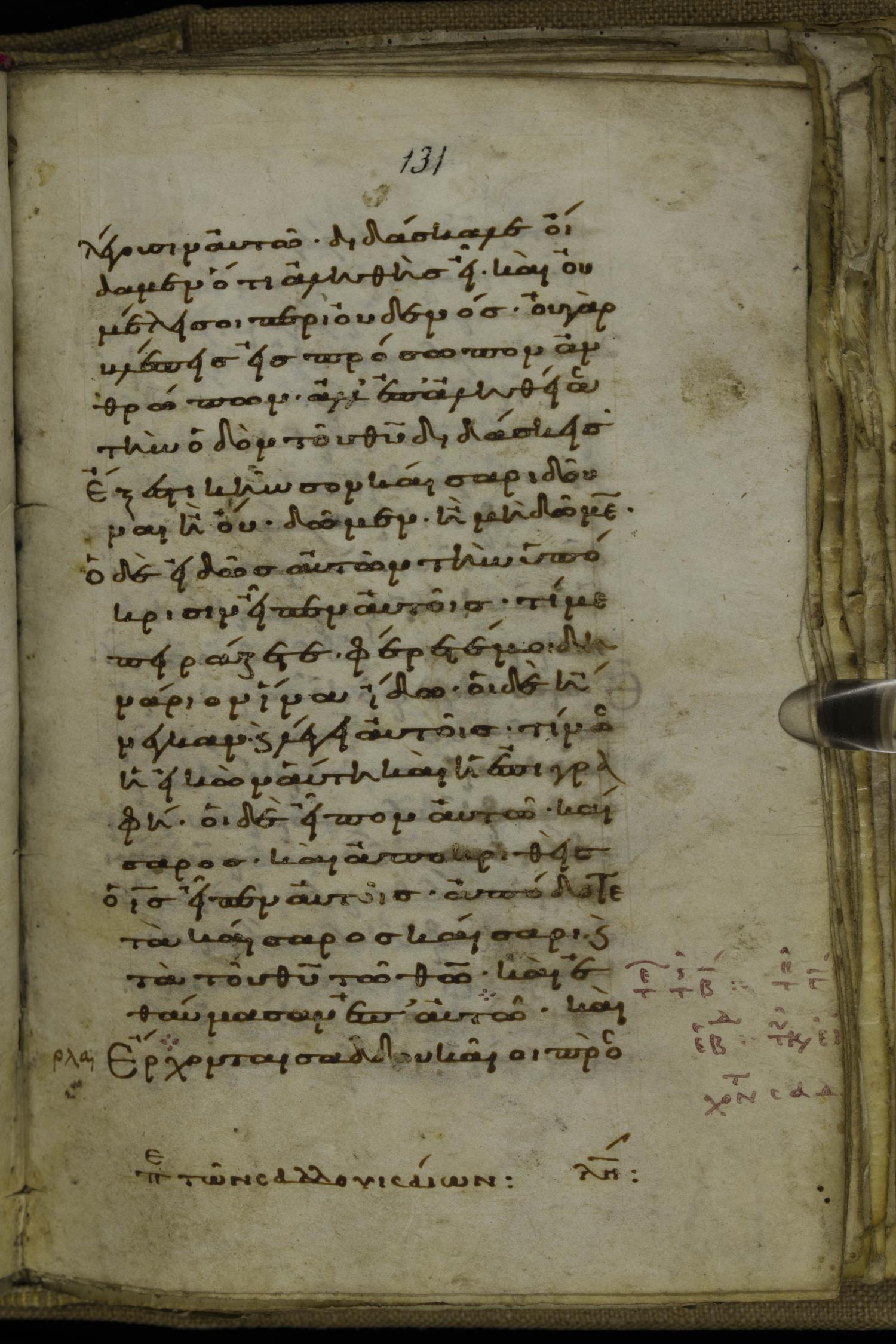 Tenth century minuscule of the Gospels on parchment; 220 leaves, 1 column, 20-21 lines per column. Images were taken at the National Library of Greece in Athens.