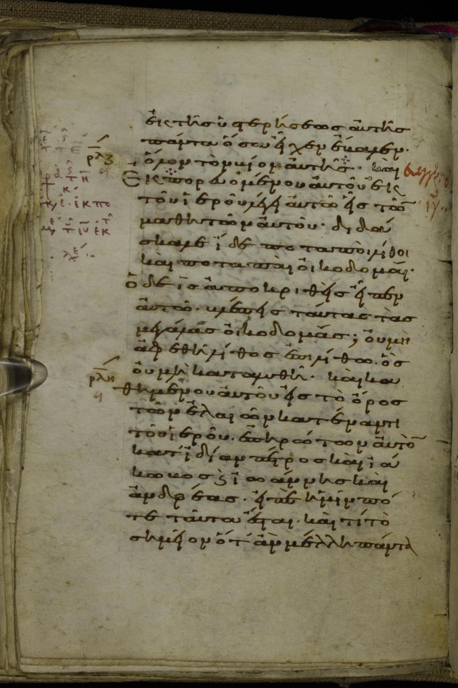 Tenth century minuscule of the Gospels on parchment; 220 leaves, 1 column, 20-21 lines per column. Images were taken at the National Library of Greece in Athens.