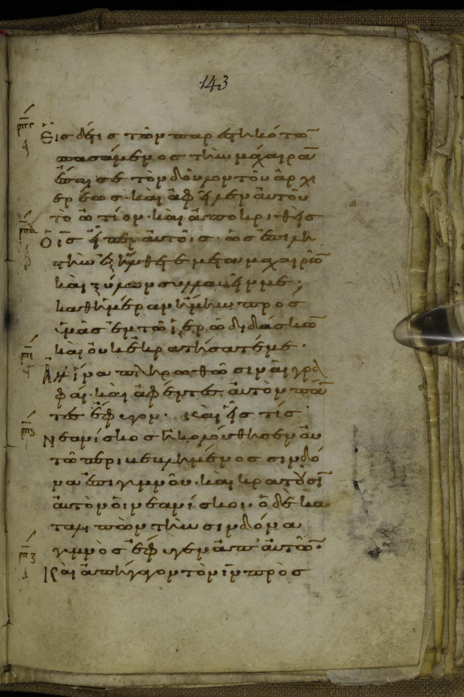 Tenth century minuscule of the Gospels on parchment; 220 leaves, 1 column, 20-21 lines per column. Images were taken at the National Library of Greece in Athens.