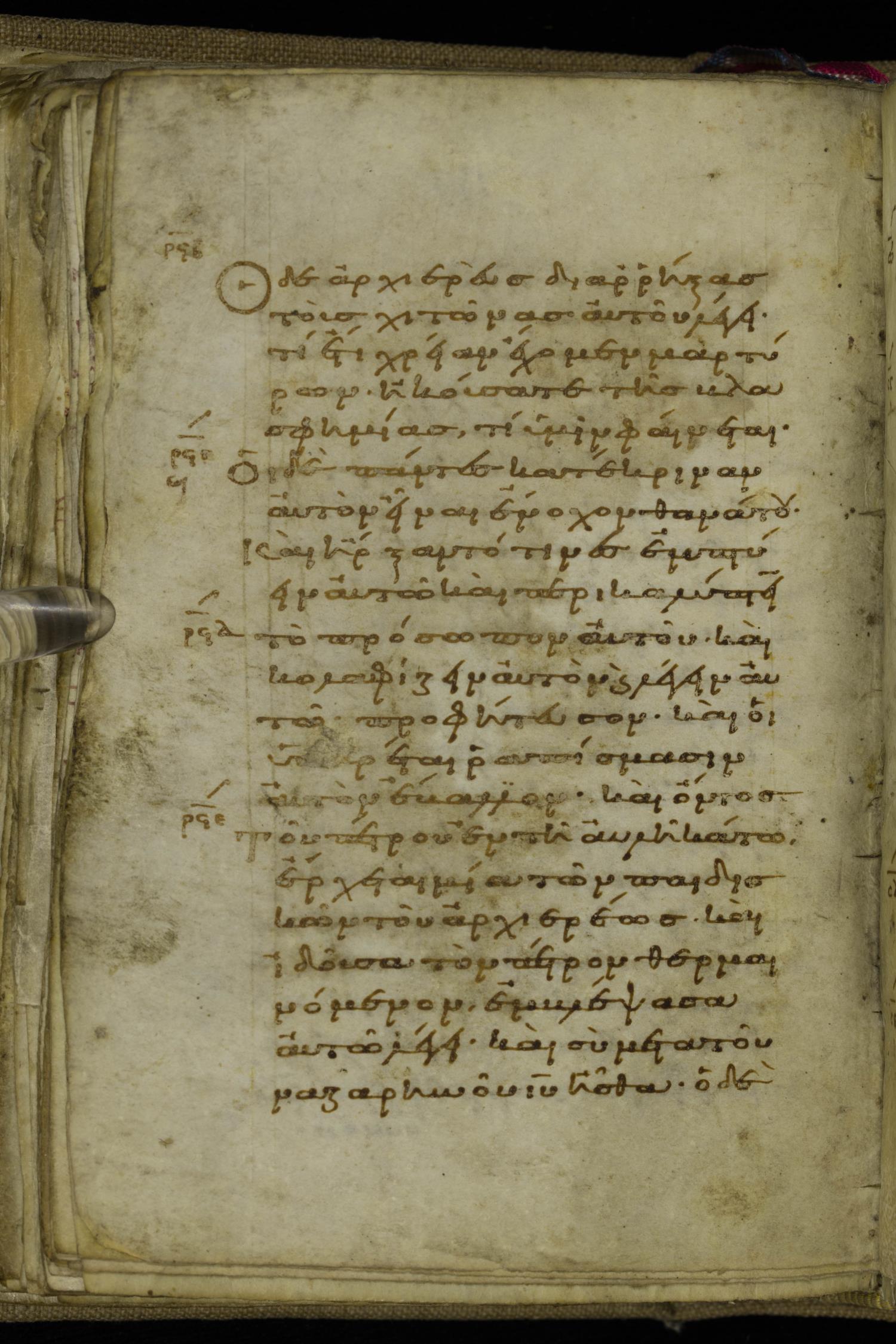 Tenth century minuscule of the Gospels on parchment; 220 leaves, 1 column, 20-21 lines per column. Images were taken at the National Library of Greece in Athens.