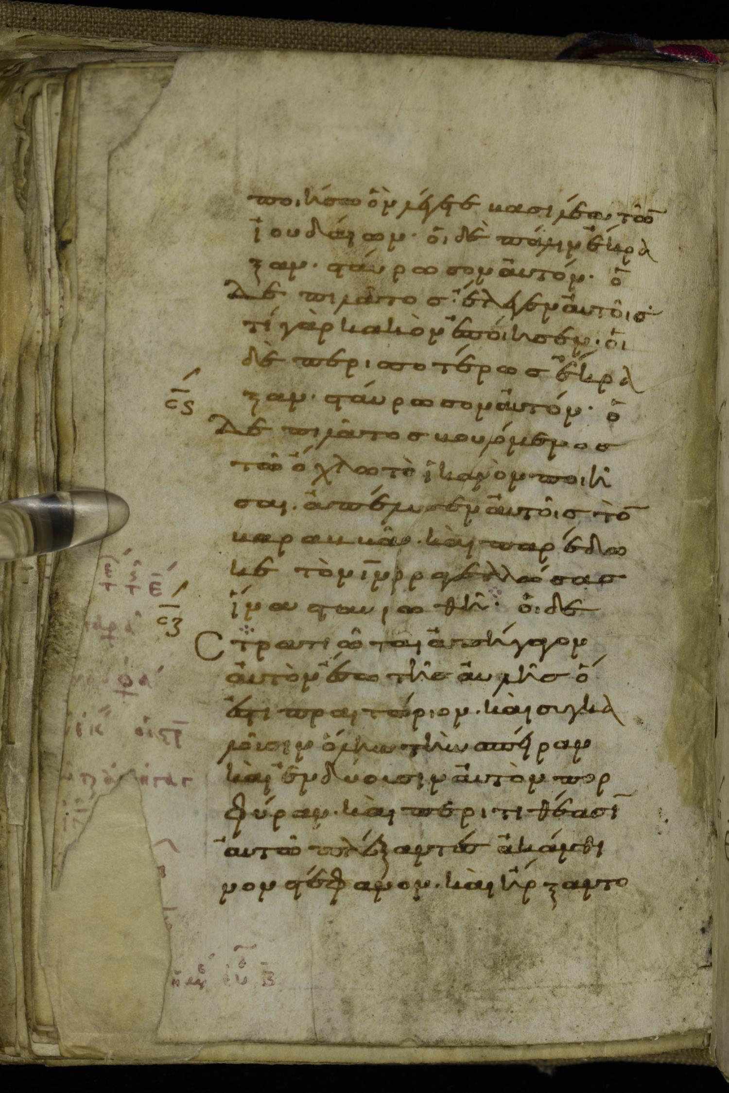 Tenth century minuscule of the Gospels on parchment; 220 leaves, 1 column, 20-21 lines per column. Images were taken at the National Library of Greece in Athens.