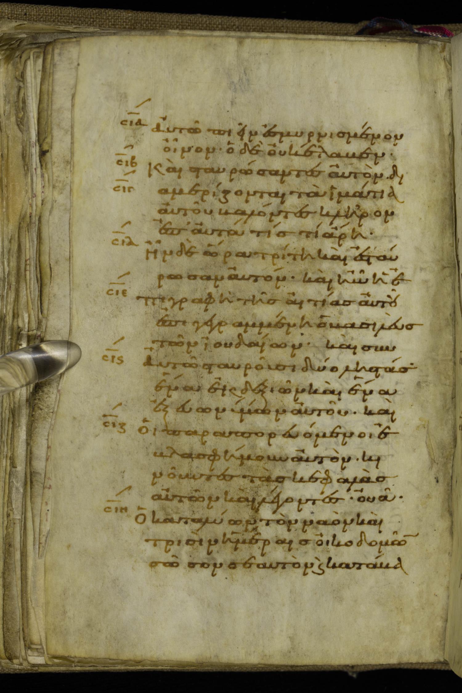 Tenth century minuscule of the Gospels on parchment; 220 leaves, 1 column, 20-21 lines per column. Images were taken at the National Library of Greece in Athens.